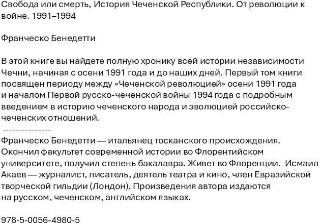 Свобода или смерть. История Чеченской Республики. От революции к войне. 1991-1994Франческо Бенедетти, Исмаил Акаев В данный момент этот товар отсутствует в продаже. Возможно, у нас найдется аналогичный или похожий товар здесь. В этой книге вы найдете полную хронику всей истории независимости Чечни, начиная с осени 1991 года и до наших дней. Первый том книги посвящен периоду между «Чеченской революцией» осени 1991 года и началом Первой русско-чеченской войны 1994 года с подробным введением в историю чеченского народа и эволюцией российско-чеченских отношений. |