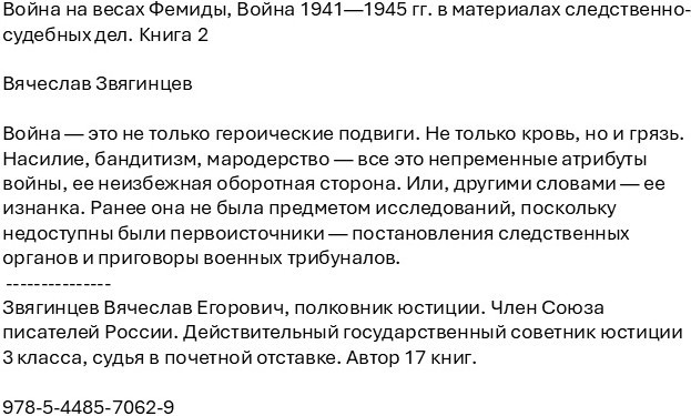 Война на весах Фемиды. Война 1941-1945 гг. в материалах следственно-судебных дел. Книга 2В данный момент этот товар отсутствует в продаже. Возможно, у нас найдется аналогичный или похожий товар здесь. Война — это не только героические подвиги. Не только кровь, но и грязь... Насилие, бандитизм, мародерство — все это непременные атрибуты войны, ее неизбежная оборотная сторона. Или, другими словами — ее изнанка. Ранее она не была предметом исследований, поскольку недоступны были первоисточники — постановления следственных органов и приговоры военных трибуналов. |