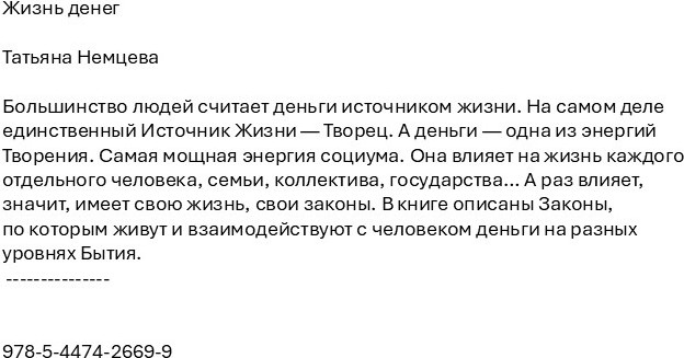 Жизнь денегВ данный момент этот товар отсутствует в продаже. Возможно, у нас найдется аналогичный или похожий товар здесь. Большинство людей считает деньги источником жизни. На самом деле единственный источник жизни — Творец. А деньги — одна из энергий Творения. Самая мощная энергия социума. Она влияет на жизнь каждого отдельного человека, семьи, коллектива, государства… А раз влияет, значит, имеет свою жизнь, свои законы. В книге описаны законы, по которым живут и взаимодействуют с человеком деньги на разных уровнях Бытия. |