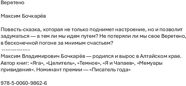 ВеретеноВ данный момент этот товар отсутствует в продаже. Возможно, у нас найдется аналогичный или похожий товар здесь. Повесть-сказка, которая не только поднимет настроение, но и позволит задуматься — а тем ли мы идем путем? Не потеряли ли мы свое Веретено, в бесконечной погоне за мнимым счастьем? |