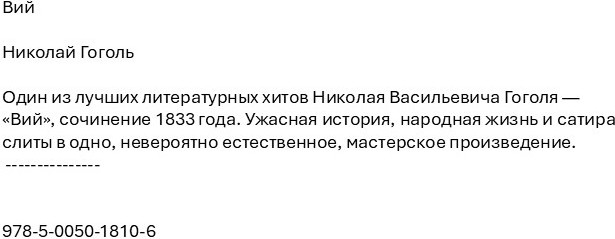 ВийВ данный момент этот товар отсутствует в продаже. Возможно, у нас найдется аналогичный или похожий товар здесь. «Вий» — мистическая повесть Н.В. Гоголя, впервые была опубликована в сборнике «Миргород» в 1835 году. Это классические ужасы и одно из самых известных произведений писателя. Повесть описывает малороссийскую культуру, быт и верования, исследует темы страха смерти и веры в Бога. |