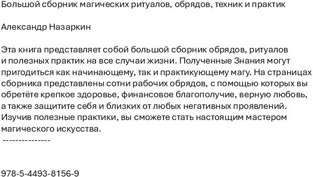 Большой сборник магических ритуалов, обрядов, техник и практикВ данный момент этот товар отсутствует в продаже. Возможно, у нас найдется аналогичный или похожий товар здесь. Эта книга - ценный источник информации, который поможет разобраться в важной теме и найти новые решения. Четкая структура, доступный язык и полезные материалы делают её удобной для изучения и применения на практике. Подходит как для новичков, так и для тех, кто хочет углубить свои знания. Незаменимый помощник для работы, обучения и личного развития! Возраст: 18+ |