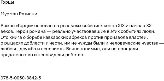 ГорцыВ данный момент этот товар отсутствует в продаже. Возможно, у нас найдется аналогичный или похожий товар здесь. Роман «Горцы» основан на реальных событиях конца XIX и начала XX веков. Герои романа — реально участвовавшие в этих событиях люди. Это книга о борьбе кавказских абреков против произвола властей, о рыцарях доблести и чести, им не чужды были и человеческие чувства — любовь, дружба и ненависть. Вечно гонимые, они не прощали предательство и ненавидели рабство. |