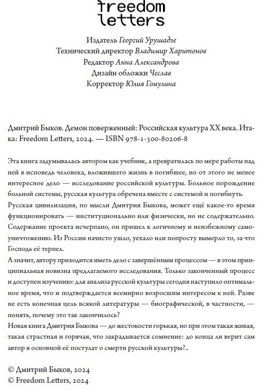 Демон поверженныйВ данный момент этот товар отсутствует в продаже. Возможно, у нас найдется аналогичный или похожий товар здесь. Эта книга задумывалась автором как учебник, а превратилась по мере работы над ней в исповедь человека, вложившего жизнь в погибшее, но от этого не менее интересное дело — исследование российской культуры. Больное порождение больной системы, русская культура обречена вместе с системой и погибнуть. Русская цивилизация, по мысли Дмитрия Быкова, может ещё какое-то время функционировать — институционально или физически, но не содержательно. Содержание проекта исчерпано, он пришел к логичному и неизбежному самоуничтожению. Из России начисто ушло, уехало или попросту вымерло то, за что Господь её терпел. А значит, автору приходится иметь дело с завершённым процессом — в этом принципиальная новизна предлагаемого исследования. Только законченный процесс и доступен изучению: для анализа русской культуры сегодня наступило оптимальное время, что и подтверждается всемирно возросшим интересом к ней. Разве не есть конечная цель всякой литературы — биографической, в частности, — понять, почему это так закончилось? Новая книга Дмитрия Быкова — до жестокости горькая, но при этом такая живая, такая страстная и горячая, что закрадывается сомнение: до конца ли верит сам автор в основной её постулат о смерти русской культуры?.. |
