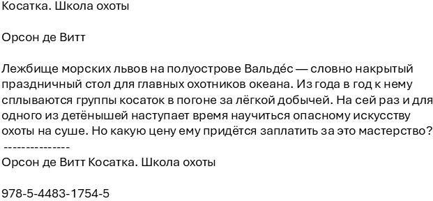 Косатка. Школа охотыВ данный момент этот товар отсутствует в продаже. Возможно, у нас найдется аналогичный или похожий товар здесь. Лежбище морских львов на полуострове Вальдес — словно накрытый праздничный стол для главных охотников океана. Из года в год к нему сплываются группы косаток в погоне за лёгкой добычей. На сей раз и для одного из детёнышей наступает время научиться опасному искусству охоты на суше. Но какую цену ему придётся заплатить за это мастерство? |