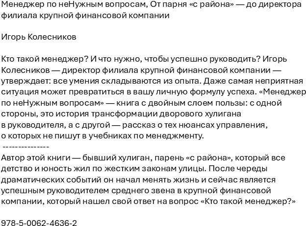 Менеджер по неНужным вопросам. От парня «с района» — до директора филиала крупной финансовой компанииВ данный момент этот товар отсутствует в продаже. Возможно, у нас найдется аналогичный или похожий товар здесь. Кто такой менеджер? И что нужно, чтобы успешно руководить? Игорь Колесников — директор филиала крупной финансовой компании — утверждает: все умения складываются из опыта. Даже самая неприятная ситуация может превратиться в вашу личную формулу успеха. «Менеджер по ненужным вопросам» — книга с двойным слоем пользы: с одной стороны, это история трансформации дворового хулигана в руководителя, а с другой — рассказ о тех нюансах управления, о которых не пишут в учебниках по менеджменту. |
