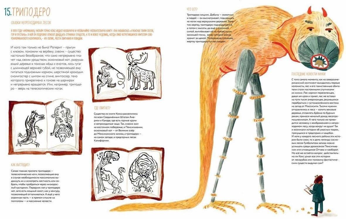 Эта книга напоминает средневековые бестиарии, чередовавшие фантастические сведения о реально существующих животных с не менее фантастическими описаниями выдуманных созданий и их привычек. Познание мира с тех пор шагнуло далеко вперед, и все-таки число чудесных тварей только прибавляется: в компанию грифона, феникса и василиска в новейшее время вошли Несси, йети, триподеро и другие. Это издание — вторая совместная работа автора и художника, предыдущая — «Книга холода, льда и снега» — рассказывала о самых разных явлениях природы, историях, легендах и обычаях, связанных с зимой и морозом. |