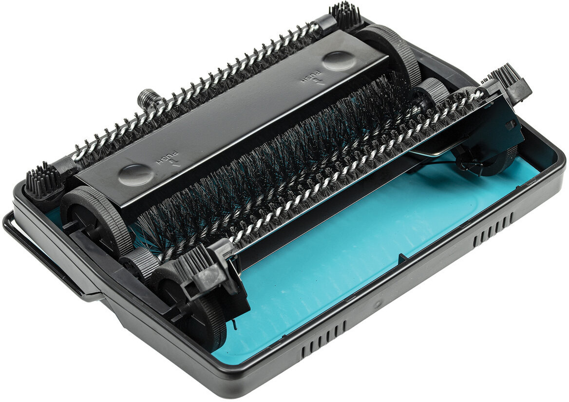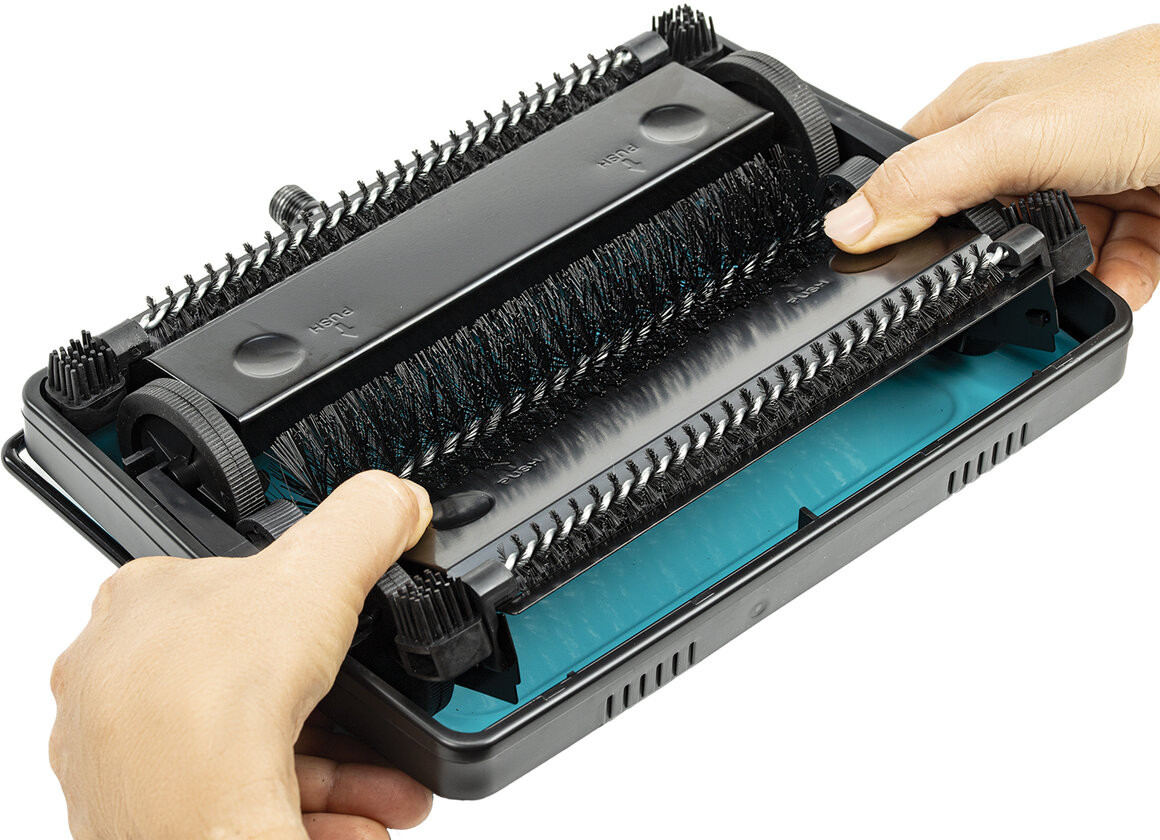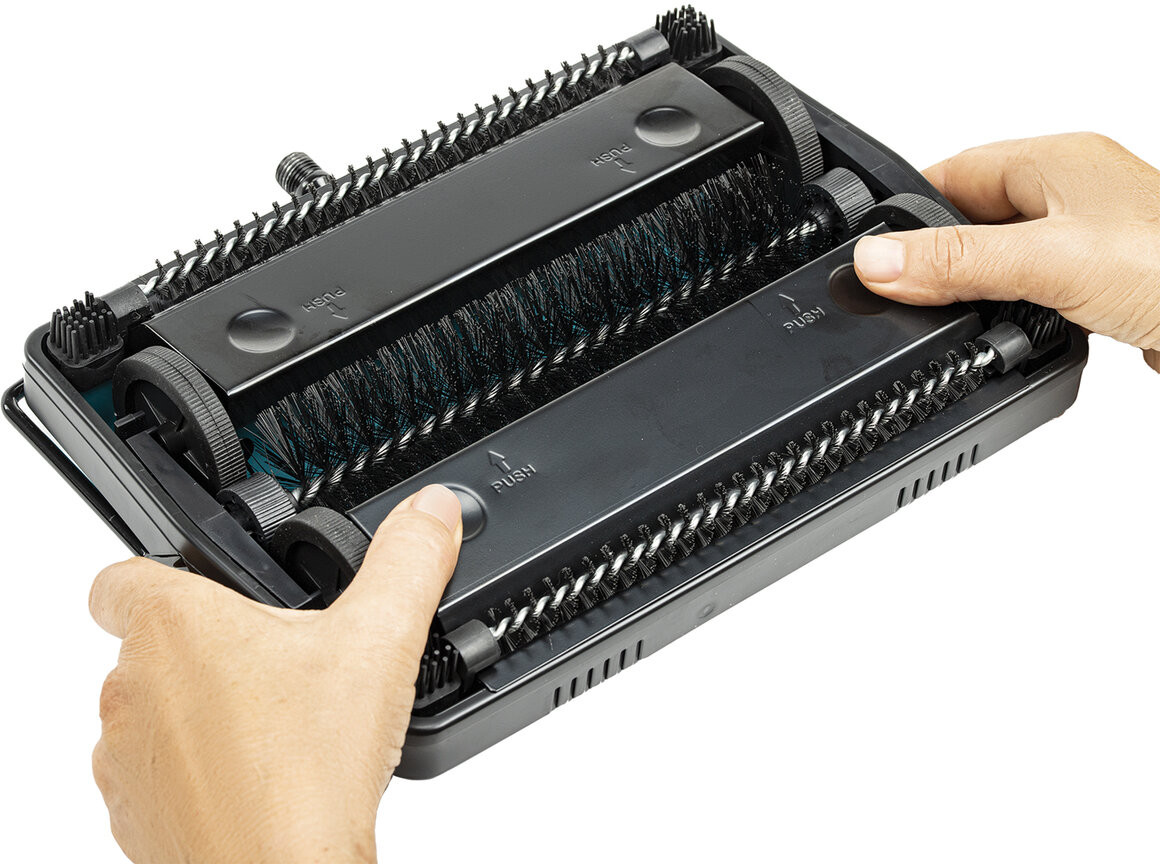 Контейнеры оснащены металлическими крышками. В закрытом состоянии они удерживают мусор внутри. При нажатии на крышки контейнеры открываются для очистки мусора. Две дополнительные узкие щетки, расположенные по краям контейнеров, легко захватывают и удерживают волосы и шерсть животных. Силиконовые щетинки, расположенные перед колесами, предотвращают попадание в них мусора, что обеспечивает движение щётки по полу без помех.