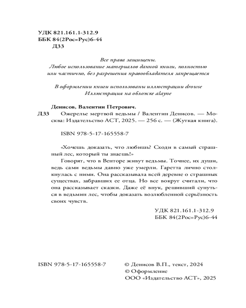 💳 Оплатить за товар можно при получении 🇰🇿 Есть бесплатная доставка по Казахстану от 1 дня 🎁 Копите бонусы с каждой покупки Серия: Жуткая книга «Хочешь доказать, что любишь? Сходи в самый страшный лес, который ты знаешь!» Говорят, что в Венторе живут ведьмы. Точнее, их души, ведь сами ведьмы давно уже умерли. Гаретта лично столкнулась с ними. Она рассказывала всей деревне о страшных существах, забравших ее отца. Но все вокруг считали, что она рассказывает сказки. Даже её внук, решивший сунуться в ведьмин лес, чтобы доказать возлюбленной серьёзность своих чувств. |
