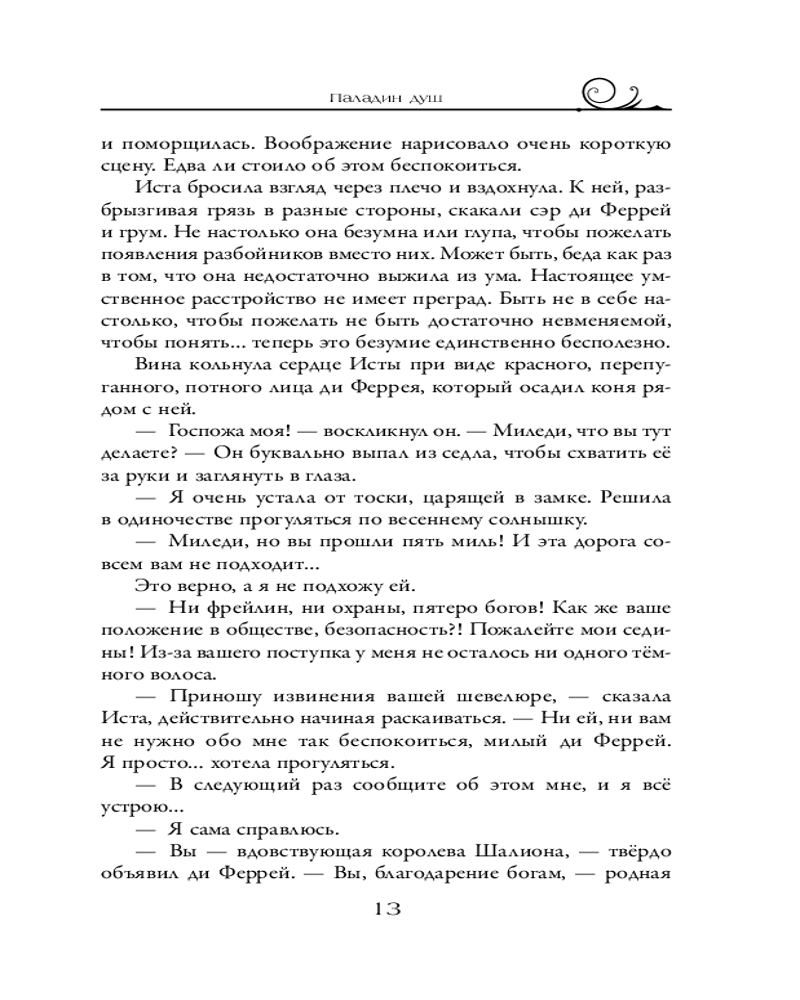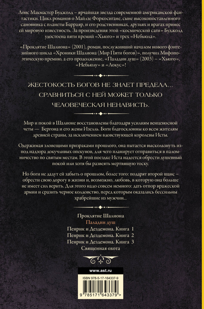 💳 Оплатить за товар можно при получении 🇰🇿 Есть бесплатная доставка по Казахстану от 1 дня 🎁 Копите бонусы с каждой покупки Серия: Хроники Шалиона Мир и покой в Шалионе восстановлены благодаря усилиям венценосной четы Бергона и его жены Изелль. Боги благосклонны ко всем жителям древней страны, за исключением вдовствующей королевы Исты. Одержимая зловещими призраками прошлого, она пытается выскользнуть из-под надзора докучливых опекунов, для чего планирует отправиться в паломничество по святым местам. В этой поездке Иста надеется обрести душевный покой или хотя бы развеять мертвящую тоску. |