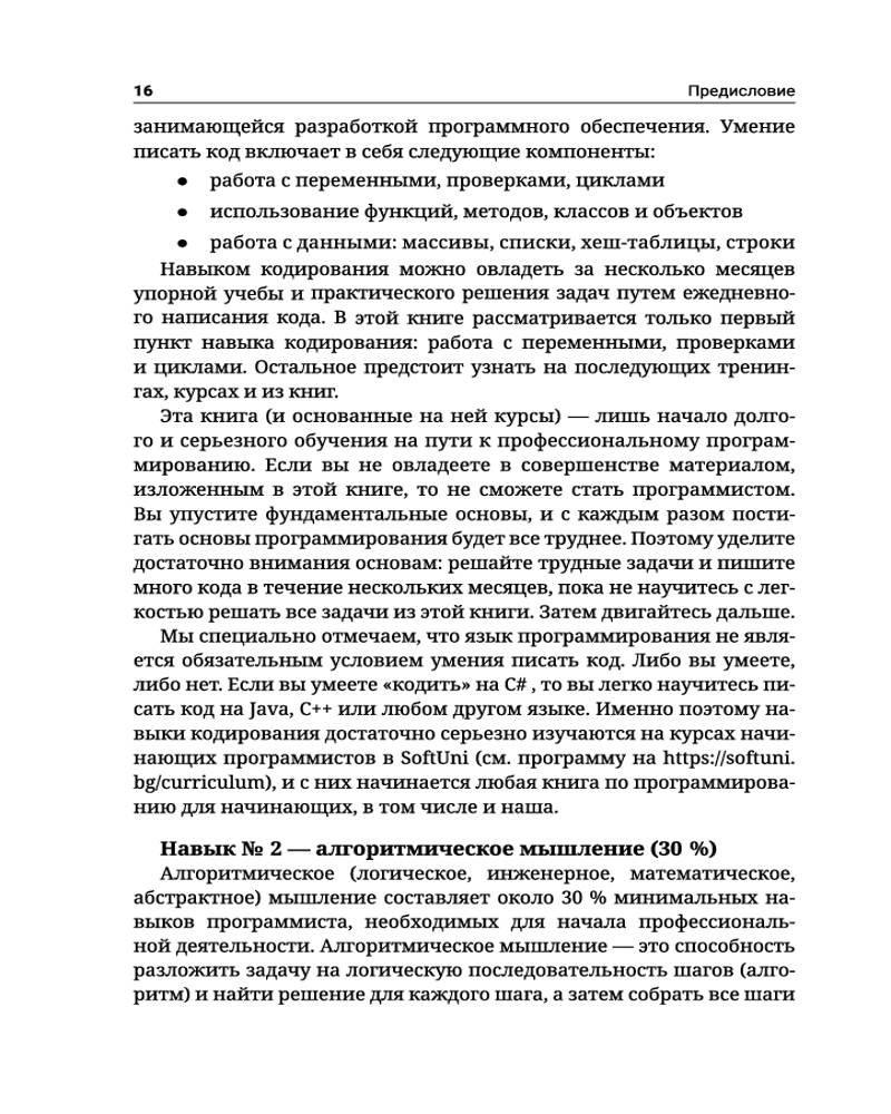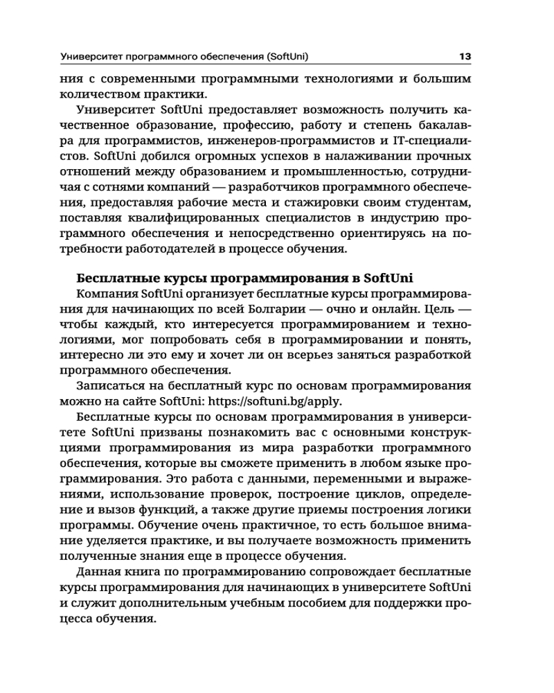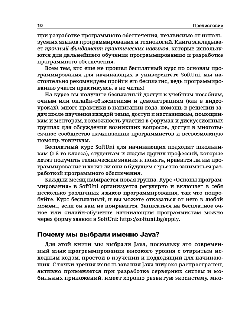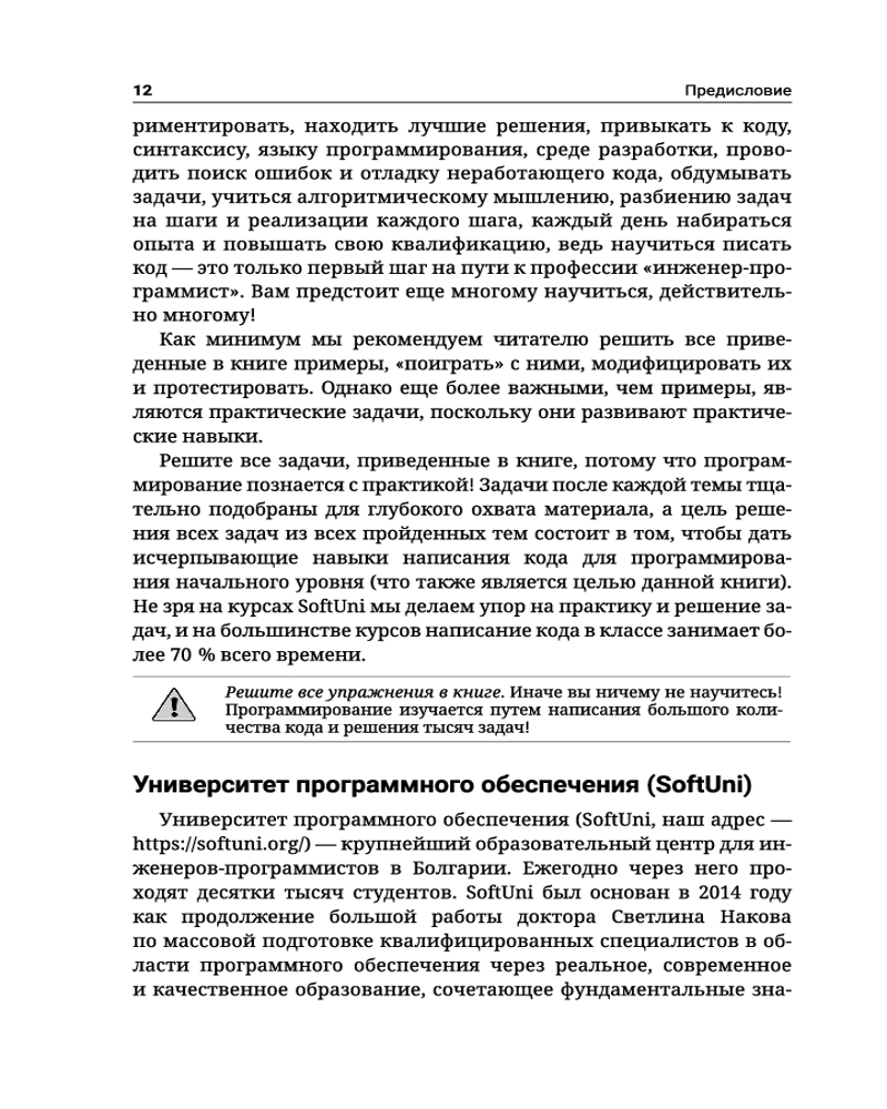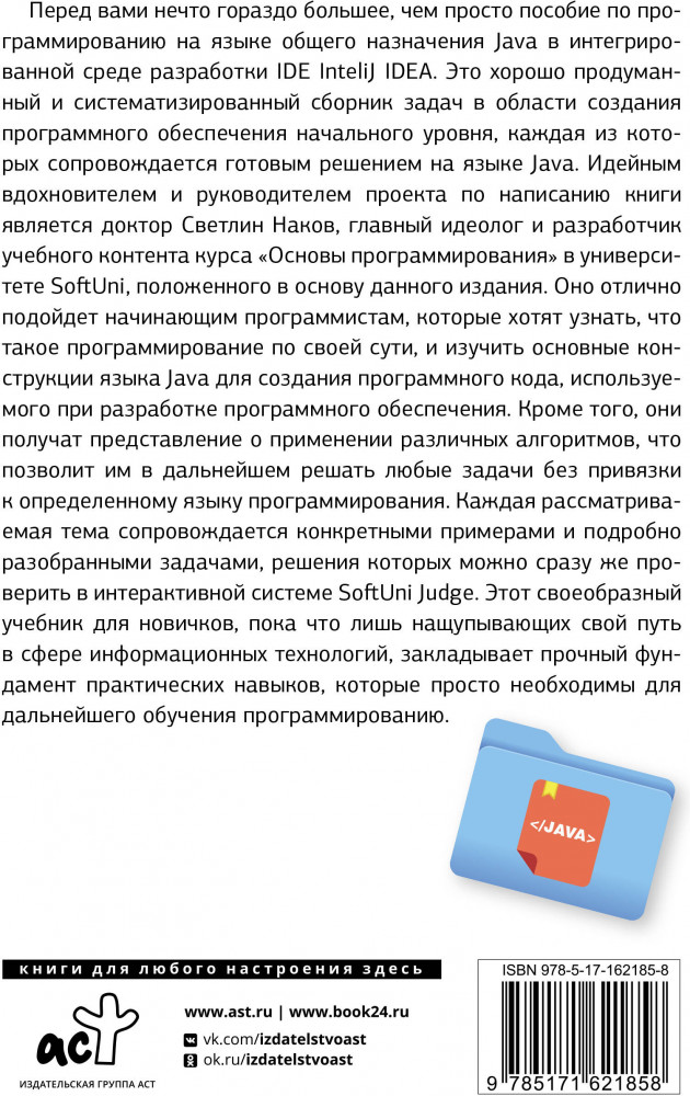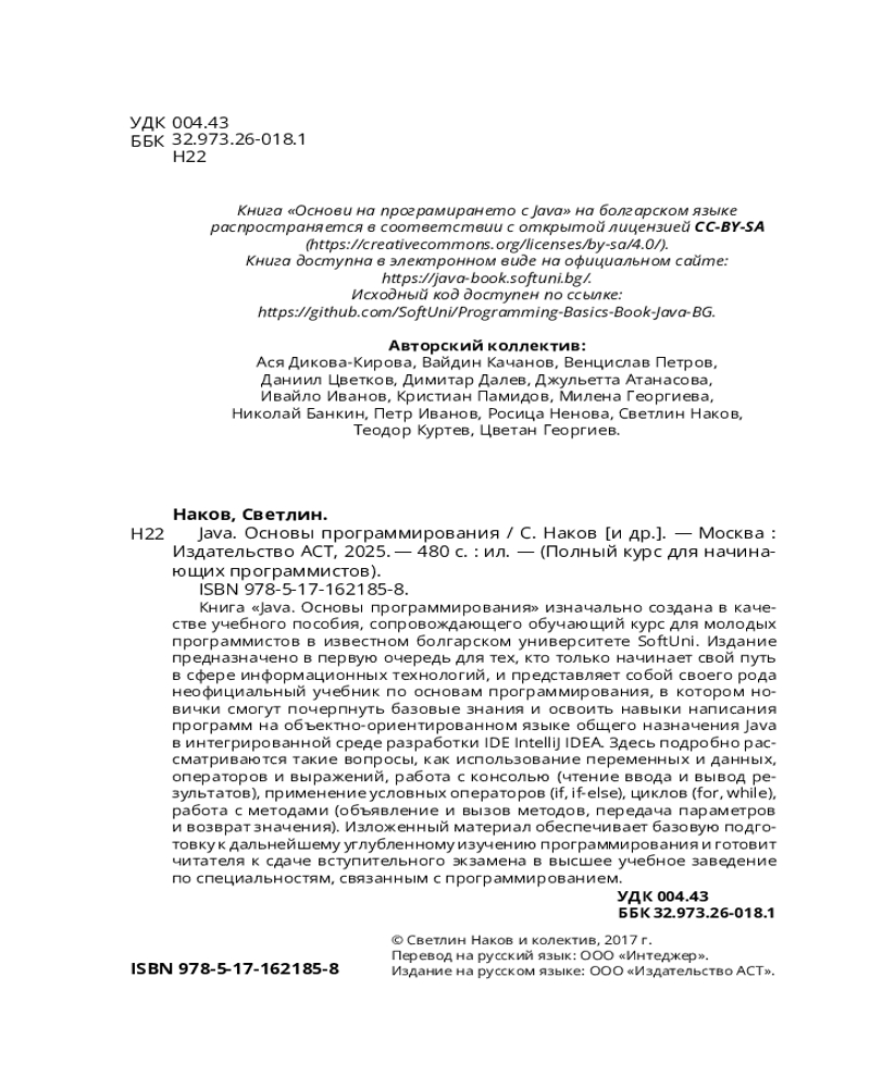 💳 Оплатить за товар можно при получении 🇰🇿 Есть бесплатная доставка по Казахстану от 1 дня 🎁 Копите бонусы с каждой покупки Серия: Полный курс для начинающих программистов Книга «Java. Основы программирования» изначально создана в качестве учебного пособия, сопровождающего обучающий курс для молодых программистов в известном болгарском университете SoftUni. Издание предназначено в первую очередь для тех, кто только начинает свой путь в сфере информационных технологий, и представляет собой своего рода неофициальный учебник по основам программирования, в котором новички смогут почерпнуть базовые знания и освоить навыки написания программ на объектно-ориентированном языке общего назначения Java в интегрированной среде разработки IDE IntelliJ IDEA. Здесь подробно рассматриваются такие вопросы, как использование переменных и данных, операторов и выражений, работа с консолью (чтение ввода и вывод результатов), применение условных операторов (if, if-else), циклов (for, while), работа с методами (объявление и вызов методов, передача параметров и возврат значения). Изложенный материал обеспечивает базовую подготовку к дальнейшему углубленному изучению программирования и готовит читателя к сдаче вступительного экзамена в высшее учебное заведение по специальностям, связанным с программированием. |