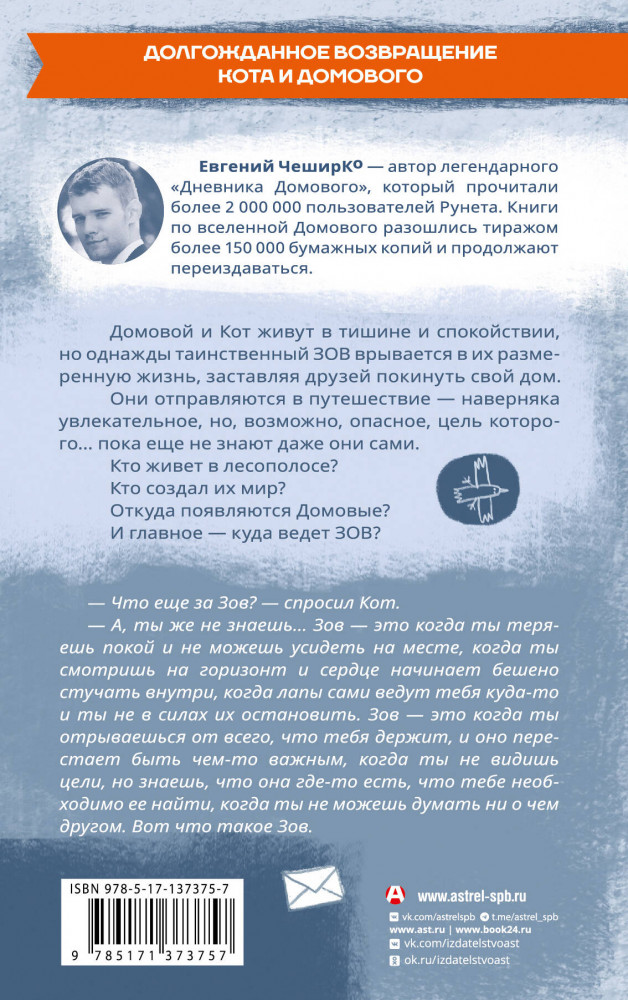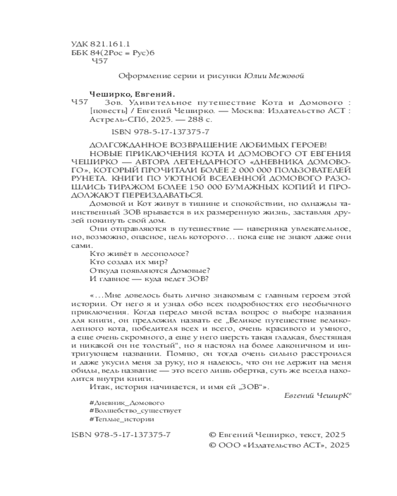 💳 Оплатить за товар можно при получении 🇰🇿 Есть бесплатная доставка по Казахстану от 1 дня 🎁 Копите бонусы с каждой покупки Серия: Книги Евгения Чеширко Домовой и Кот живут в тишине и спокойствии, но однажды таинственный ЗОВ врывается в их размеренную жизнь, заставляя друзей покинуть свой дом. Они отправляются в путешествие — наверняка увлекательное, но, возможно, опасное, цель которого... пока еще не знают даже они сами. Кто живёт в лесополосе? Кто создал их мир? Откуда появляются Домовые? И главное — куда ведёт ЗОВ? |