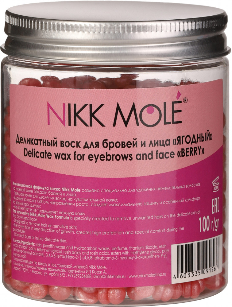 Обладает нежной текстурой, легко застывает и захватывает короткие волоски на неровных поверхностях. Комфортен в использовании, позволяет избежать ожогов, гипоаллергенный. Не оставляет следов, идеально подходит для чувствительной кожи. Воск идеально убирает пушок, не обламывая волосок, равномерно, тонко наносится, работает в любых направлениях. Среди всех процедур по оформлению бровей коррекция бровей воском занимает одно из лидирующих мест. Коррекция бровей воском эффективность подтверждена многолетней историей и множеством довольных женщин. Это неудивительно, ведь воск позволяет захватить даже тонкие прозрачные волоски, делая кожу по-настоящему гладкой и нежной. Кроме того, для коррекции бровей воском требуется минимум инструментов и времени. Инновационная формула воска для бровей и лица Никк Моле создана специально для ваксинга бровей при удаления нежелательных волосков на нежной коже области бровей и лица.