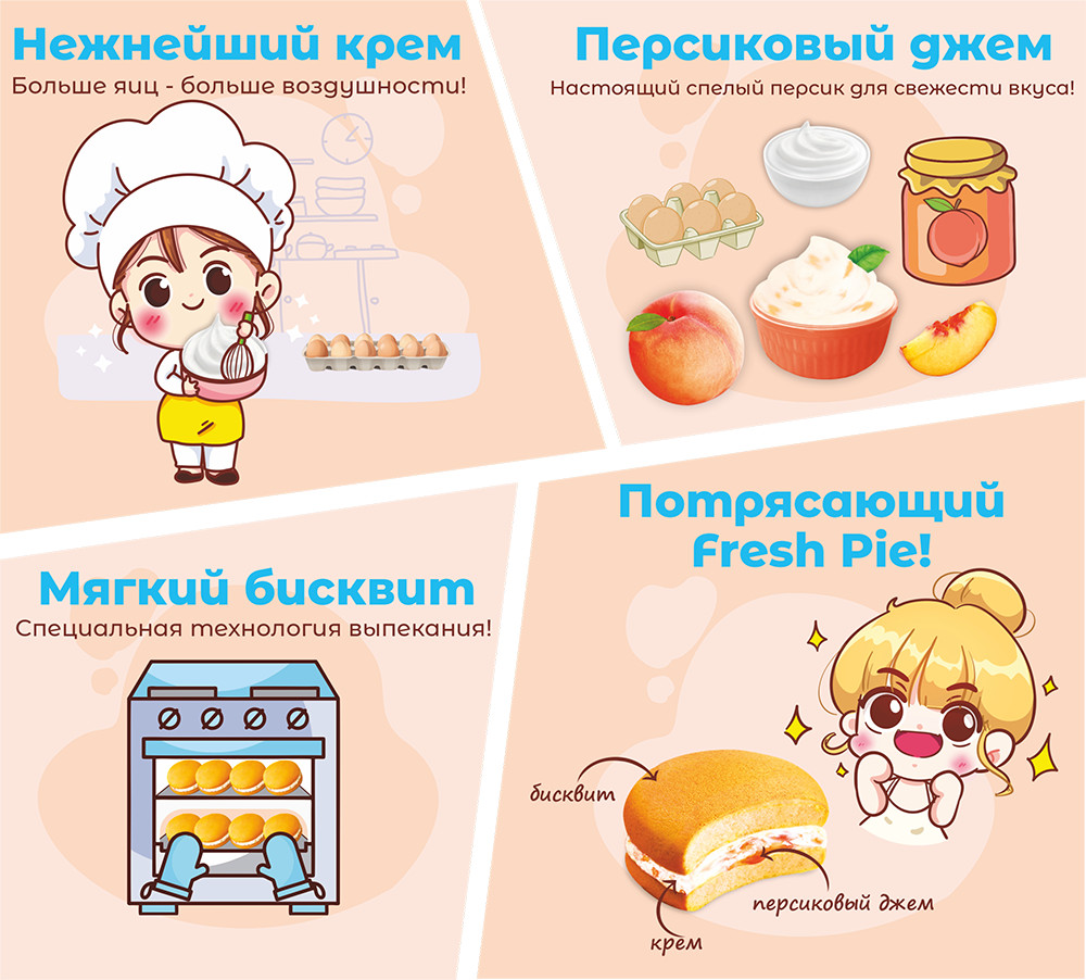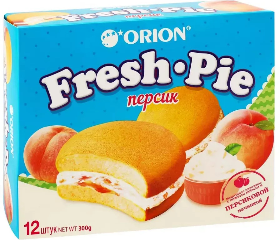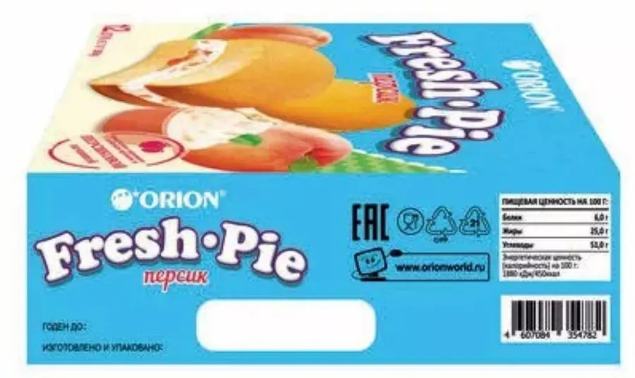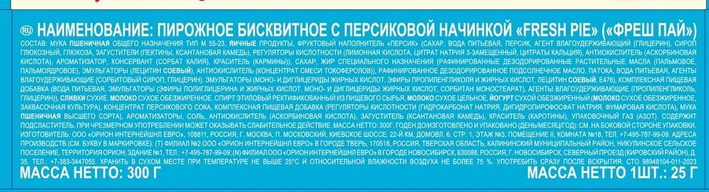 Мука пшеничная общего назначения тип М 55-23, яичные продукты, фруктовый наполнитель Персик сахар, вода питьевая, персик, агент влагоудерживающий глицерин, сироп глюкозный, глюкоза, загустители пектины, ксантановая камедь, регуляторы кислотности лимонная кислота, цитрат натрия 3-замещенный, цитраты кальция, антиокислитель аскорбиновая кислота, ароматизатор, консервант сорбат калия, краситель кармины, сахар, жир специального назначения рафинированные дезодорированные растительные масла пальмовое, пальмоядровое, эмульгаторы лецитин соевый, антиокислитель концентрат смеси токоферолов, рафинированное дезодорированное подсолнечное масло, патока, вода питьевая, агенты влагоудерживающие сорбитовый сироп, глицерин, эмульгаторы моно — и диглицериды жирных кислот, эфиры пропиленгликоля и жирных кислот, лецитин соевый, Е476, комплексная пищевая добавка вода питьевая, эмульгаторы эфиры полиглицерина и жирных кислот, моно — и диглицериды жирных кислот, сорбитан моностеарат, агенты влагоудерживающие пропиленгликоль, глицерин, сливки сухие, молоко сухое обезжиренное, спирт этиловый ректификованный из пищевого сырья, молоко сухое цельное, йогурт сухой обезжиренный молоко сухое обезжиренное, заквасочная культура, концентрат персикового сока, комплексная пищевая добавка регуляторы кислотности гидрокарбонат натрия, дигидропирофосфат натрия, фумаровая кислота, мука пшеничная высшего сорта, ароматизаторы, соль, антиокислитель аскорбиновая кислота, загуститель ксантановая камедь, краситель каротины, упаковочный газ азот.