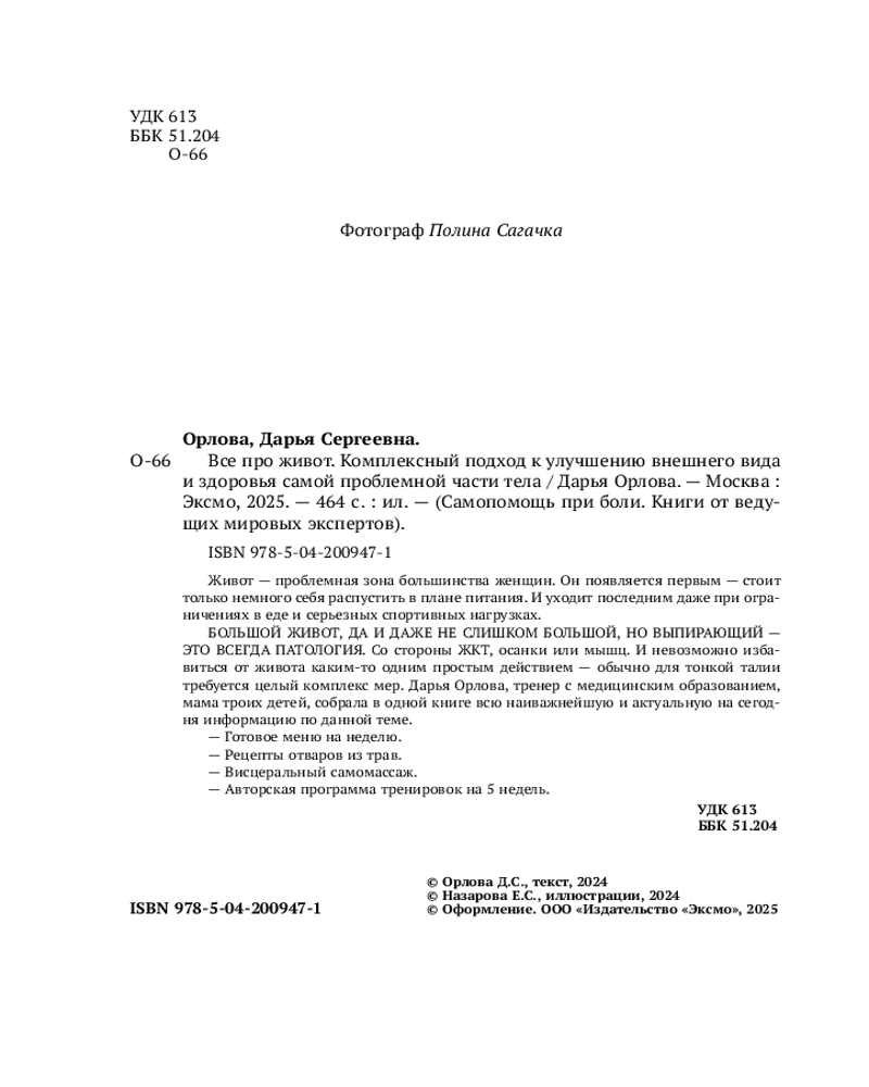 💳 Оплатить за товар можно при получении 🇰🇿 Есть бесплатная доставка по Казахстану от 1 дня 🎁 Копите бонусы с каждой покупки Серия: Самопомощь при боли. Книги от ведущих мировых экспертов Сидишь на диетах, а живот не уходит? Упражнения не дают результатов? В этой книге дипломированный косметолог-эстетист, нутрициолог и тренер Дарья Орлова раскроет секрет идеального женского живота. Автор поделится ценными советами, которые подойдут каждой. |