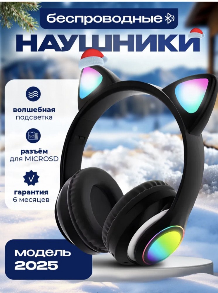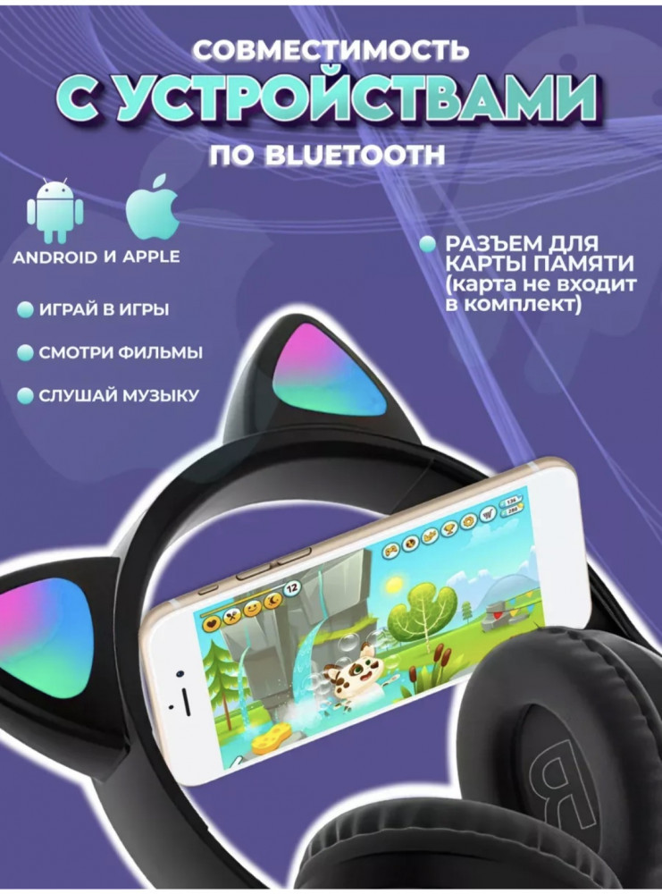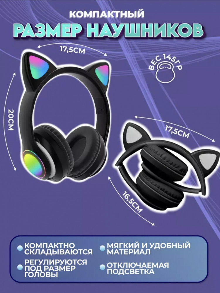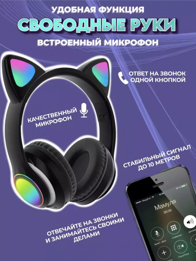 Детские наушники SТ№ −28—это оригинальные беспроводные детские наушники с ушками и подсветкой. Данные наушники совместимы с компьютером, телефоном и планшетом, что позволяет использовать их как на прогулке или в путешествии, так и за компьютерными играми. Светящиеся наушники обладают высоким качеством звука: Н|-FІ стереозвучание, мощные басы, большие динамики 40 мм, шумоподавление. Накладные наушники с ушами изготовлены из гипоаллергенных материалов и полностью безопасны. Гаджет имеет размеры 20×17.5 см, компактно складывается, а мягкие накладки делают его более удобными. Гарнитура имеет два способа подключения: через Bluetooth (блютуз) или кабелем 3,5 мм mini-jack, что дает возможность сделать наушники проводными для подключения к любому устройству, в том числеи пк. Подходит для подключения к Androld (андроид) и IОS. Полноразмерные наушники «Ушки кошки» имеют встроенный микрофон благодаря которому вы сможете отвечать на звонки или записывать видеоролики. Для более комфортного пользования в технику встроены ЕМ-радио и МРЗ-плеер, а также имеется разъем для micro SD.