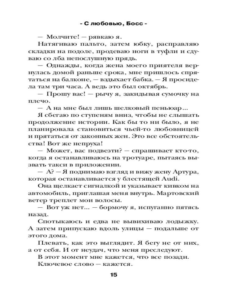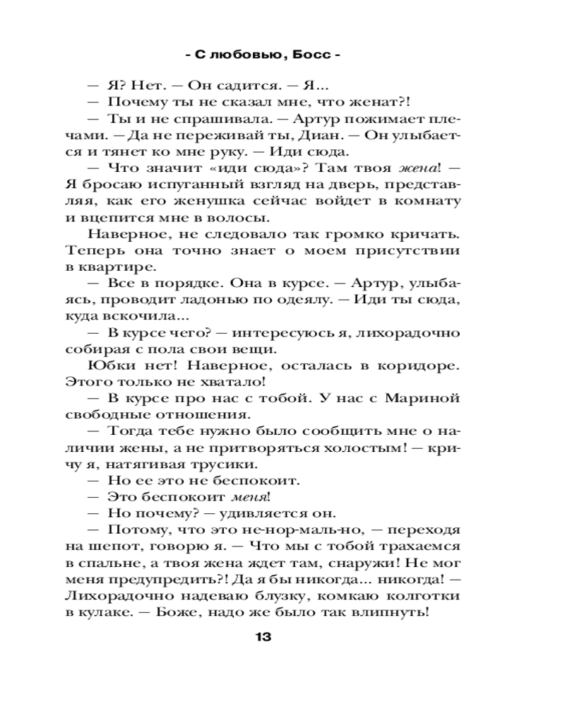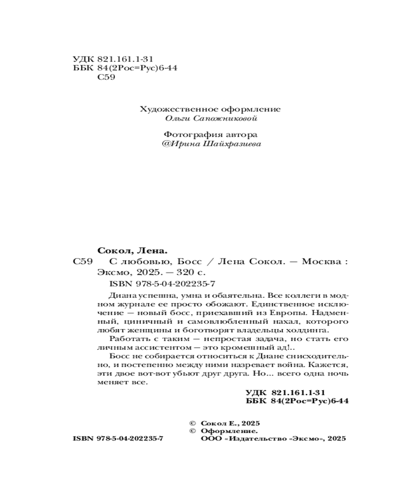💳 Оплатить за товар можно при получении 🇰🇿 Есть бесплатная доставка по Казахстану от 1 дня 🎁 Копите бонусы с каждой покупки Серия: Романтика Лены Сокол Диана успешна, умна и обаятельна. Все коллеги в модном журнале ее просто обожают. Единственное исключение — новый босс, приехавший из Европы. Надменный, циничный и самовлюбленный нахал, которого любят женщины и боготворят владельцы холдинга. Работать с таким — непростая задача, но стать его личным ассистентом — это кромешный ад!.. Босс не собирается относиться к Диане снисходительно, и постепенно между ними назревает война. Кажется, эти двое вот-вот убьют друг друга. Но... всего одна ночь меняет все. |