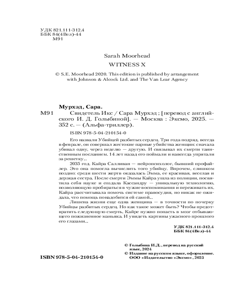 💳 Оплатить за товар можно при получении 🇰🇿 Есть бесплатная доставка по Казахстану от 1 дня 🎁 Копите бонусы с каждой покупки Серия: Альфа-триллер Его назвали Убийцей разбитых сердец. Три года подряд, всегда в феврале, он совершал жестокие парные убийства женщин: сначала убивал одну, через неделю — другую. И связывал их смерти таинственным посланием. 14 лет назад его поймали и навсегда упрятали за решетку... |