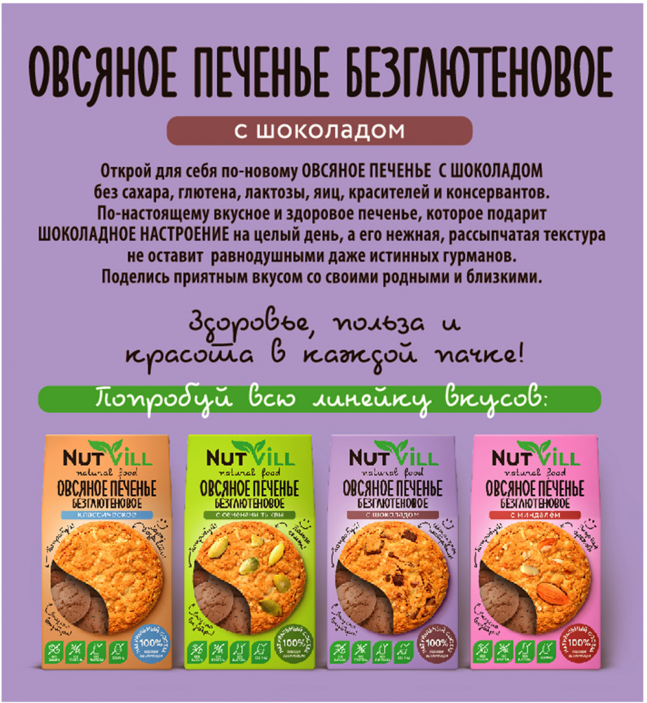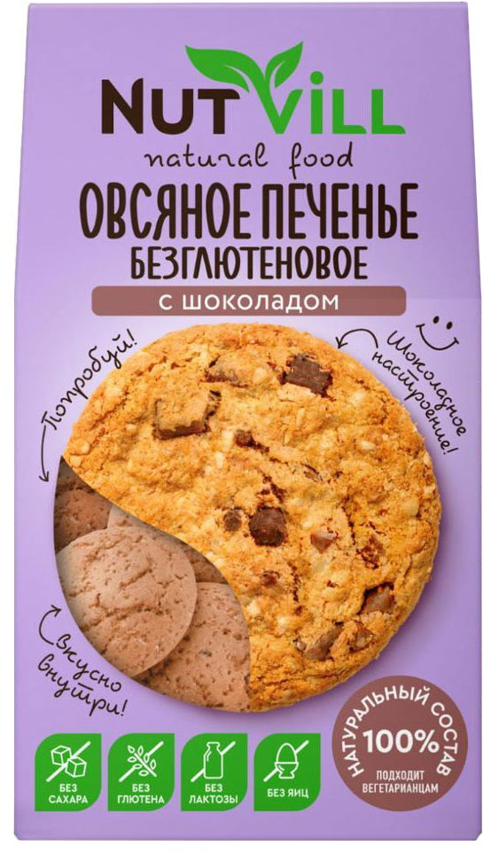 Печенье овсяное NutVill разработаны по уникальному авторскому рецепту при участии диетологов. Открой для себя по-новому овсяное печенье с шоколадом без сахара, глютена, лактозы, яиц, красителей и консервантов. По-настоящему вкусное и здоровое печенье, которое подарит заряд бодрости на целый день, а его нежная, рассыпчатая текстура не оставит равнодушными даже истинных гурманов. Однако, эти вкусные лакомства радуют не только своим ароматом и вкусом, но и своими полезными свойствами. Они изготавливаются без добавления сахара, поэтому становятся настоящим подарком для тех, кто хочет соблюдать здоровый образ жизни и отказаться от лишних сладостей.