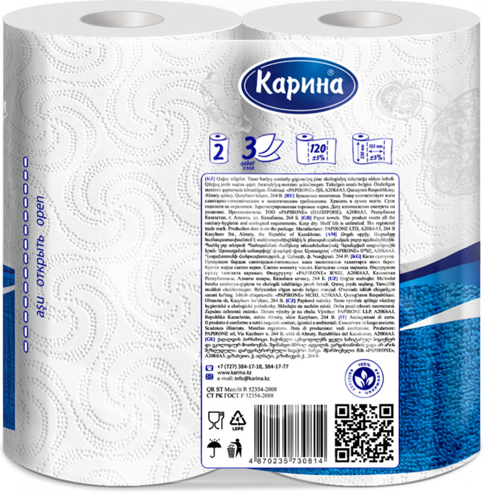 Казахстанская компания производитель бумажной санитарно-гигиенической продукции. Туалетная бумага и салфетки фирмы «Карина» — стандарт «де-факто» в домашнем хозяйстве и на производстве. |