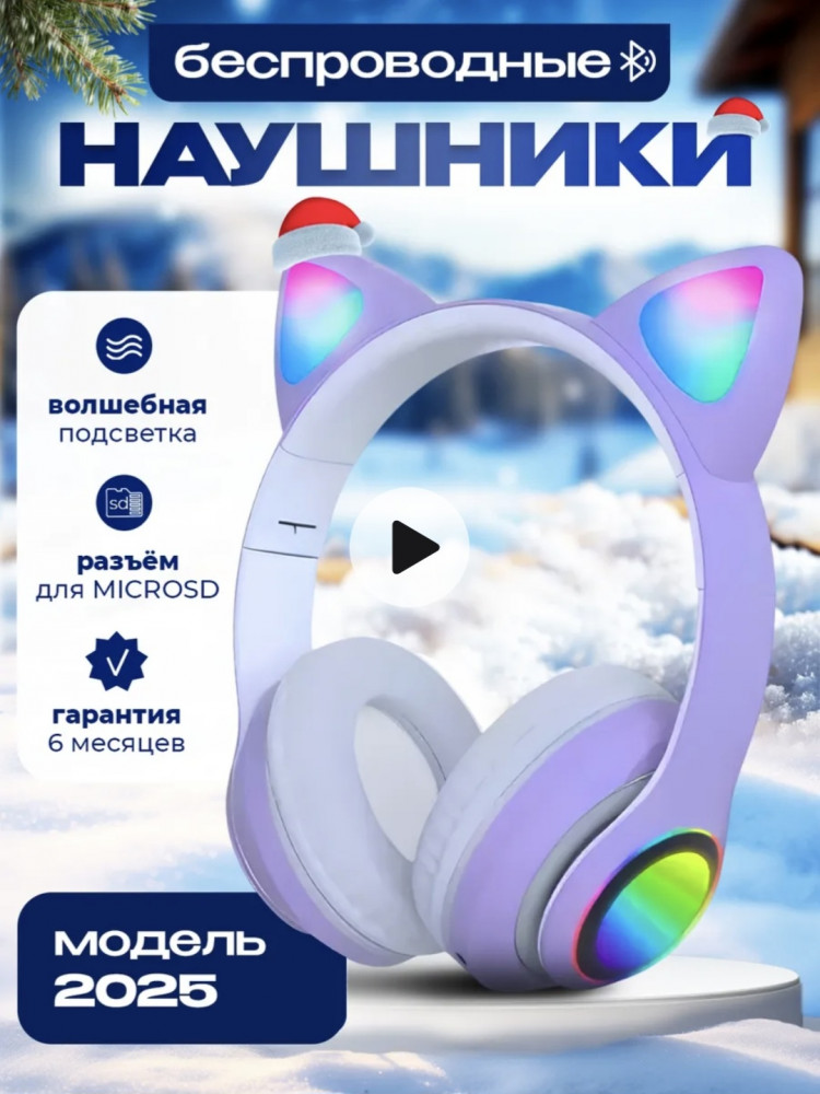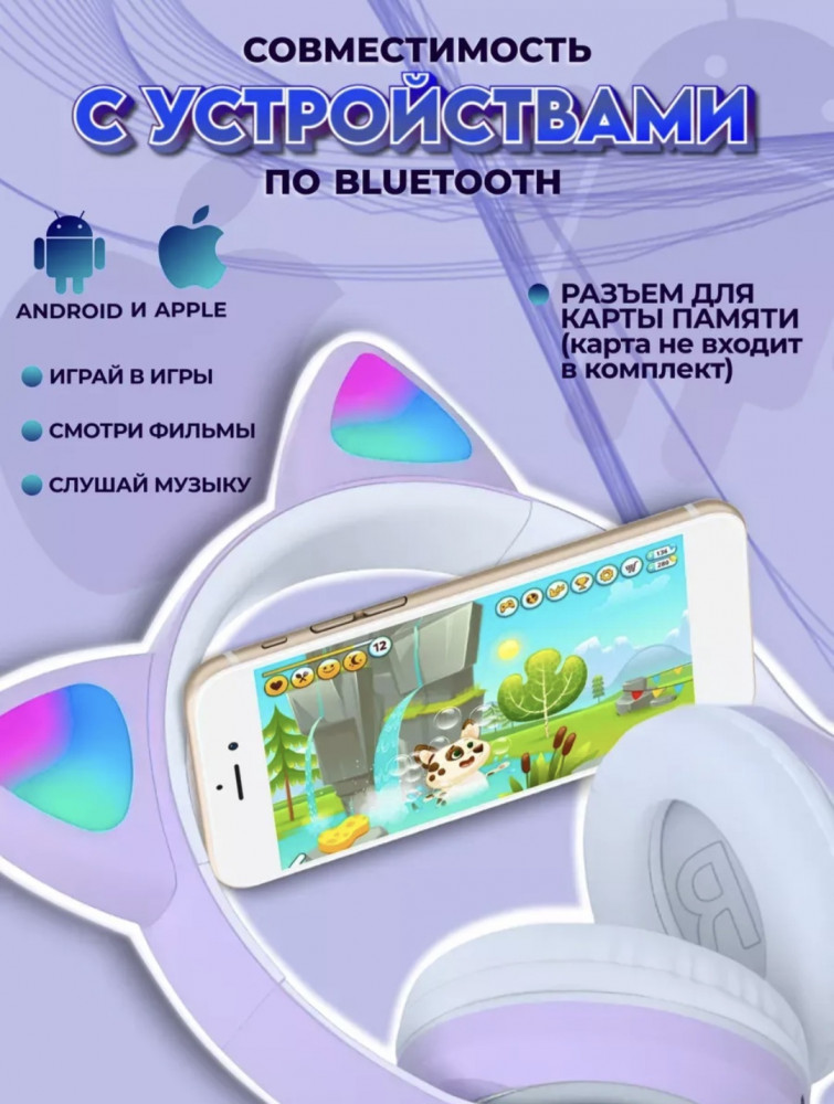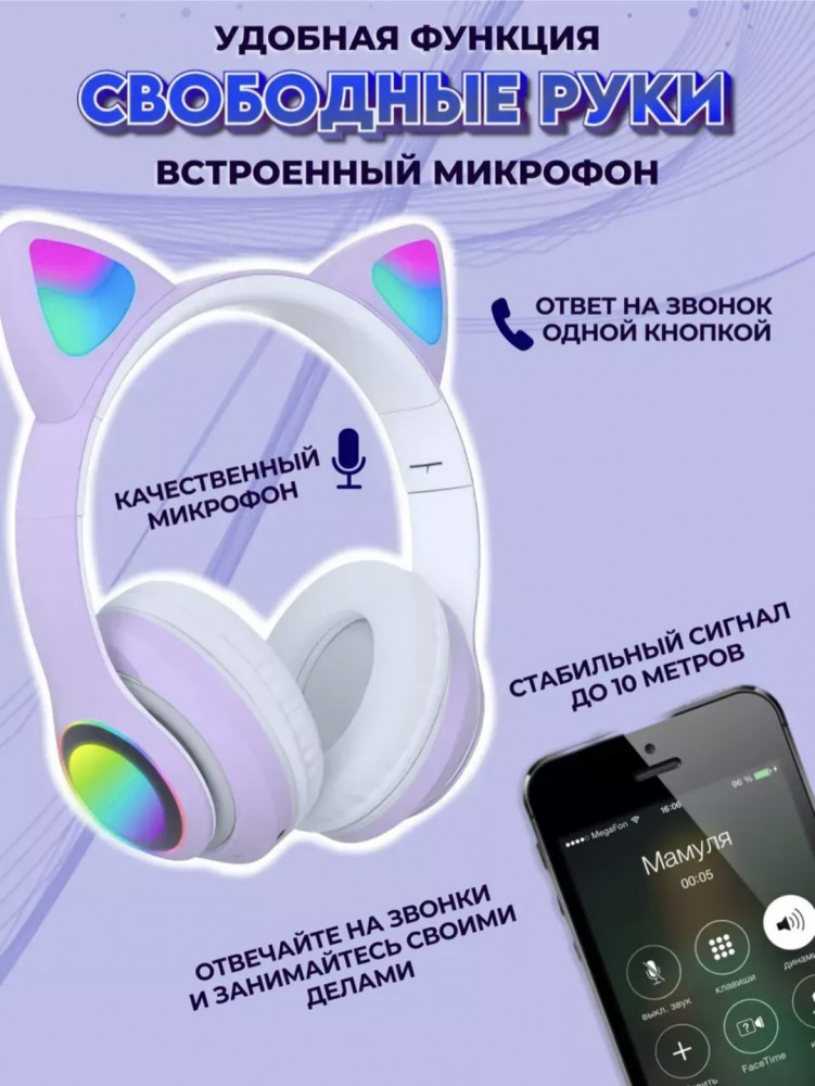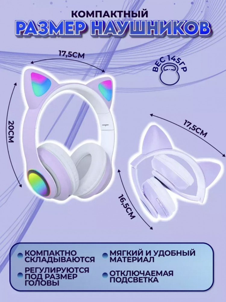 Детские наушники SТ№ −28—это оригинальные беспроводные детские наушники с ушками и подсветкой. Данные наушники совместимы с компьютером, телефоном и планшетом, что позволяет использовать их как на прогулке или в путешествии, так и за компьютерными играми. Светящиеся наушники обладают высоким качеством звука: Н|-FІ стереозвучание, мощные басы, большие динамики 40 мм, шумоподавление. Накладные наушники с ушами изготовлены из гипоаллергенных материалов и полностью безопасны. Гаджет имеет размеры 20×17.5 см, компактно складывается, а мягкие накладки делают его более удобными. Гарнитура имеет два способа подключения: через Bluetooth (блютуз) или кабелем 3,5 мм mini-jack, что дает возможность сделать наушники проводными для подключения к любому устройству, в том числеи пк. Подходит для подключения к Androld (андроид) и IОS. Полноразмерные наушники «Ушки кошки» имеют встроенный микрофон благодаря которому вы сможете отвечать на звонки или записывать видеоролики. Для более комфортного пользования в технику встроены ЕМ-радио и МРЗ-плеер, а также имеется разъем для micro SD.
