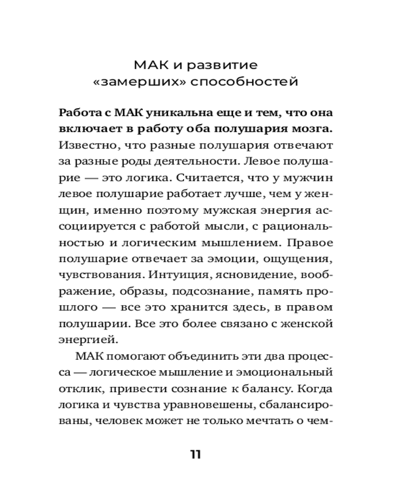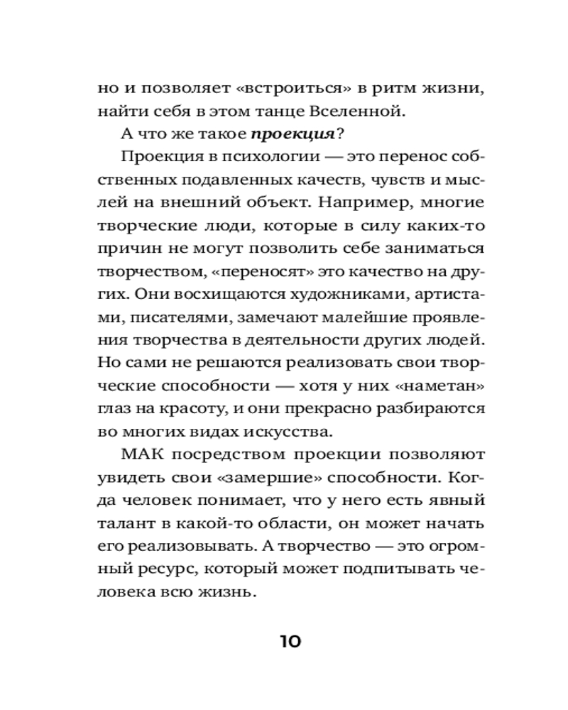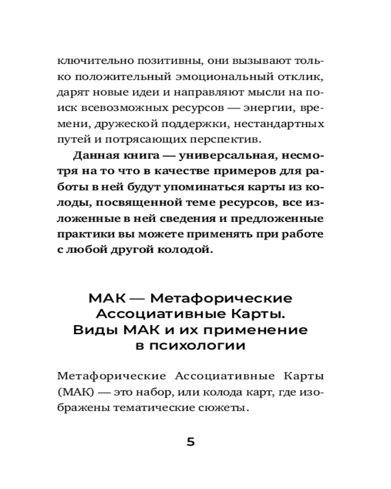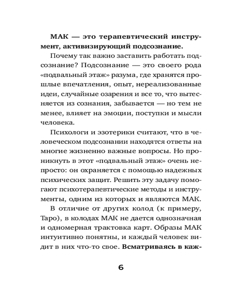 Будут полезны они и тем, кто хочет справиться с ощущением бессилия, «обнуленности» и опустошенности. Это универсальный ключ к источнику энергии, который вернет вам радость жизни, покажет ваши лучшие стороны и поможет принять себя таким, как есть. Вы научитесь использовать универсальные техники, подходящие для работы с любыми МАК (метафорическими ассоциативными картами). МАК — это колода карт, терапевтический инструмент, активизирующий подсознание. Именно в нем хранятся ответы на многие жизненно важные вопросы, но проникнуть в этот «подвальный этаж» очень непросто: он охраняется с помощью надежных психологических защит. Решить эту задачу помогают психотерапевтические методы и инструменты, одним из которых и являются МАК.