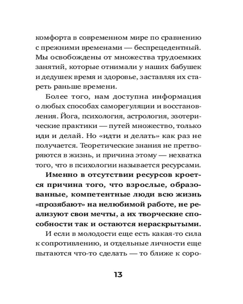 Серия: Магический помощник Перед каждым современным человеком открыто множество возможностей: от получения новых знаний и навыков и выбора занятия по душе до продвижения в любой области деятельности. Но не все ими пользуются, и лишь единицы добиваются больших высот — у остальных хватает сил лишь на то, чтобы «выживать». И это при том, что мы освобождены от множества трудоемких занятий, которые отнимали у наших бабушек и дедушек время и здоровье, заставляя их стареть раньше времени. Более того, нам доступна информация о множестве способов саморегуляции и восстановления. Но почему же мы не используем эти знания на практике?! Причина проста — нам не хватает того, что в психологии называется ресурсами.