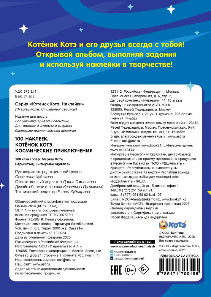 💳 Оплатить за товар можно при получении 🇰🇿 Есть бесплатная доставка по Казахстану от 1 дня 🎁 Копите бонусы с каждой покупки Серия: Котенок Котэ. Наклейки Котёнок Котэ и его друзья всегда с тобой! Открывай альбом, выполняй задания и используй наклейки в творчестве! |