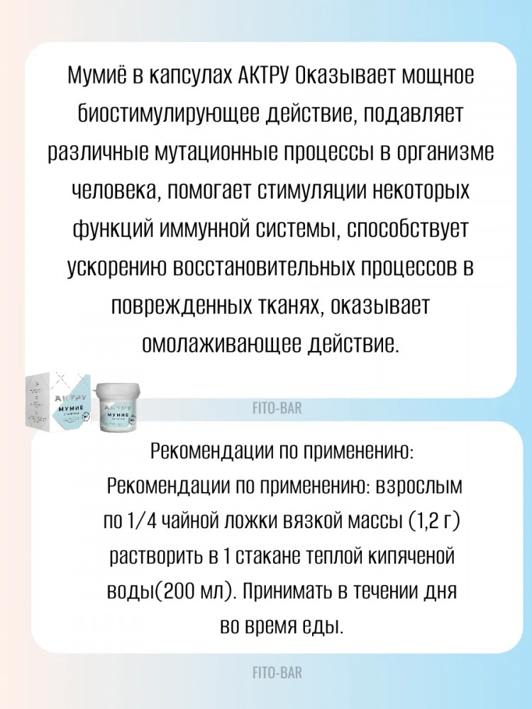 В данный момент этот товар отсутствует в продаже. Возможно, у нас найдется аналогичный или похожий товар здесь. Компания «Актру», с глубоким уважением к традициям народной медицины, с радостью представляет вам мумие «Алтайское» — уникальный комплекс, созданный самой природой. Этот продукт имеет горное происхождение и является полностью натуральным.