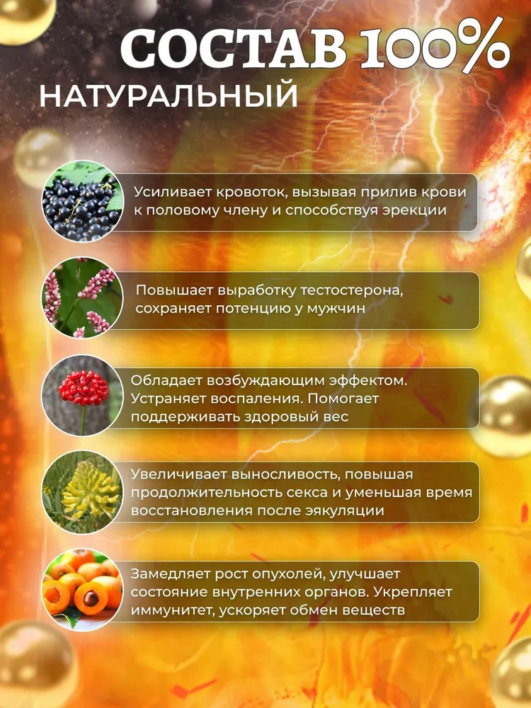 Нет никаких сведений о составе, о сертификации в РК, с осторожностью применять для мужчин старше 30, с гипертонией и т.д. Т.к. очень сильно 2 дня болела голова, было не до …. Просто черная упаковка в целлофане и все. Сомнительного происхождения!
