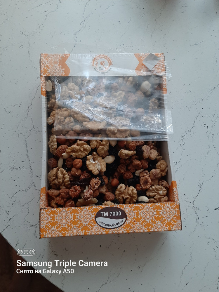 бразильским орехом даже "не пахнет," миндаль,кешью по 3 штучки грецкого ореха побольше,но не свежий, черный изюм дешёвый,арахис в очень твердой сахарной корочке.