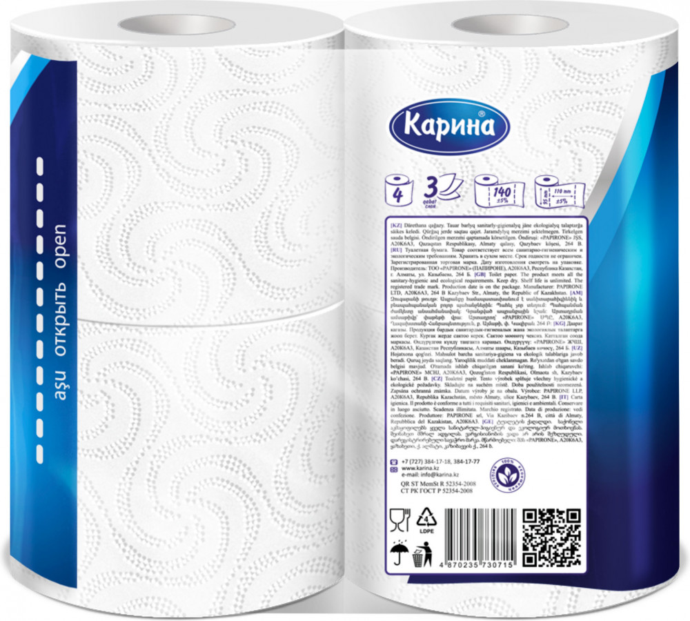 Казахстанская компания производитель бумажной санитарно-гигиенической продукции. Туалетная бумага и салфетки фирмы «Карина» — стандарт «де-факто» в домашнем хозяйстве и на производстве. |