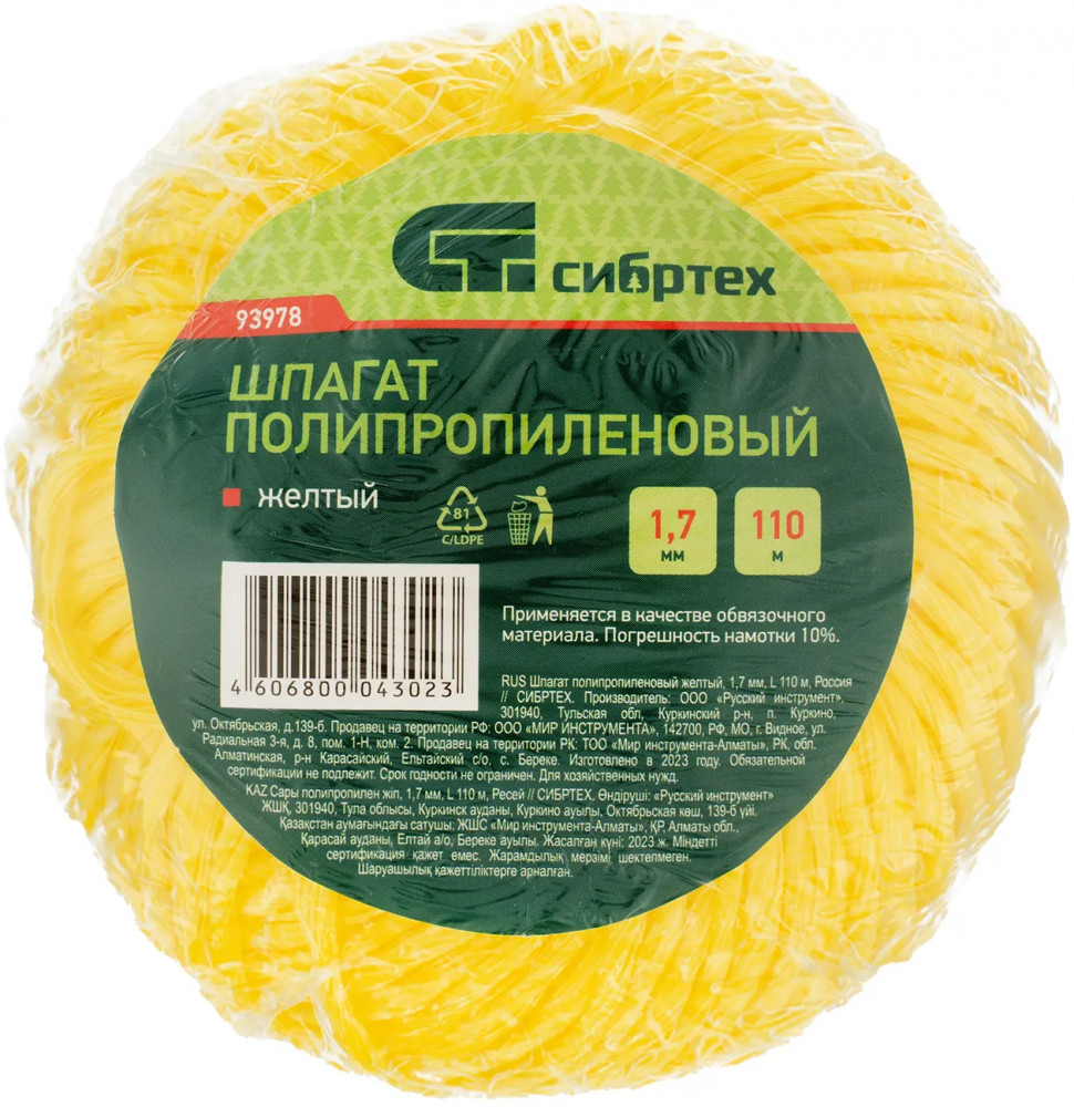 Желтый полипропиленовый шпагат Сибртех 93978 диаметром 1,7 мм и длиной 110 м используется для упаковки грузов, связывания предметов, подвязки растений и решения других задач. Шпагат имеет многониточную свивку и выдерживает разрывную нагрузку 50 кгс. Бобину можно разматывать как с внутренней, так и с наружной стороны. Шпагат будет полезен в сельском хозяйстве, на складе, производстве, а также дома или на даче.