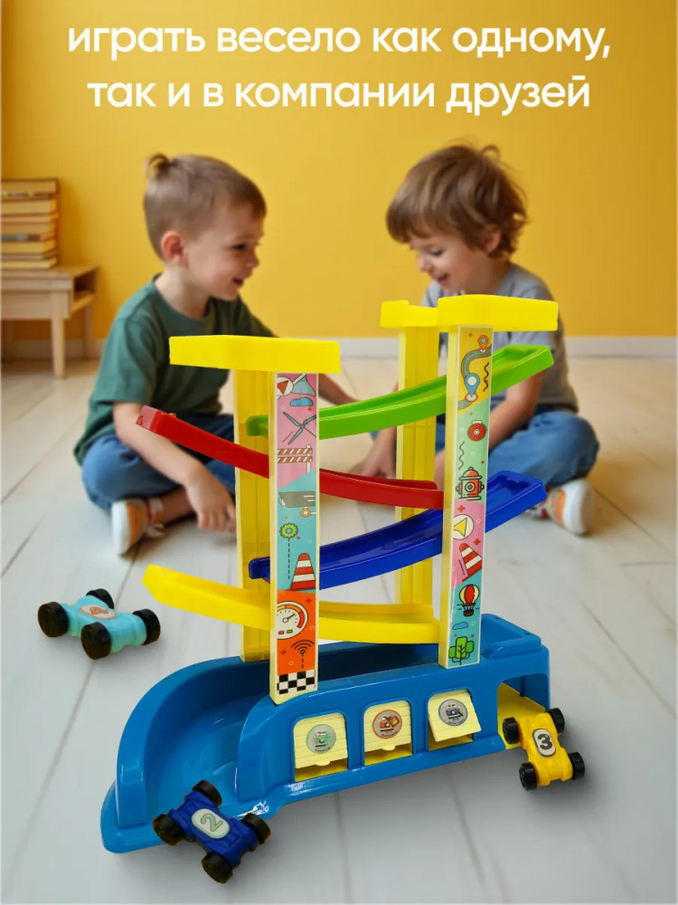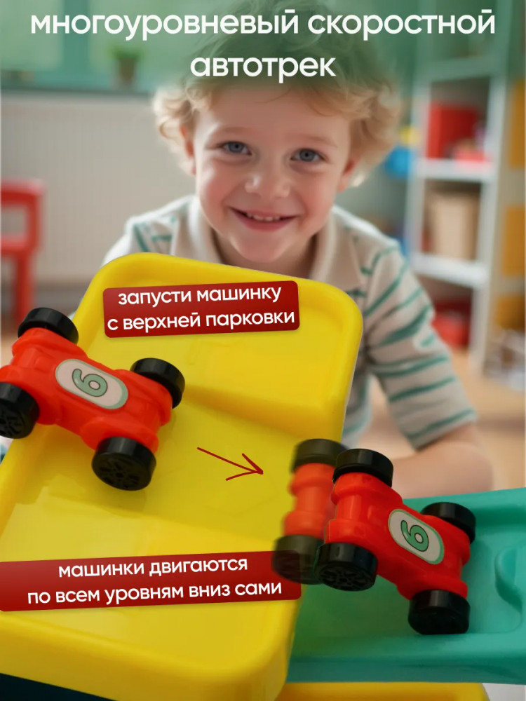 Все спортивные автомобили разгоняются с одинаковой скоростью в любом направлении, что придаёт игре динамику и реалистичность. Игрушка не требует от детей особых умений и навыков: просто поставьте машинку на верхнюю площадку и слегка толкните. Интерактивный набор подарит вашему ребёнку массу положительных эмоций и полезных навыков. Запуск игрушечных машинок помогает улучшить координацию движений и развить мелкую моторику. Устройте соревнование: пусть каждый ребёнок выберет свой любимый гоночный болид и попробует управлять им.