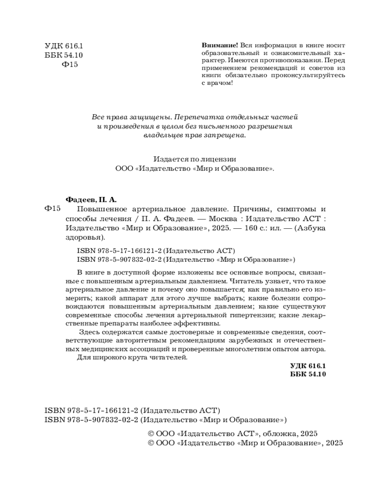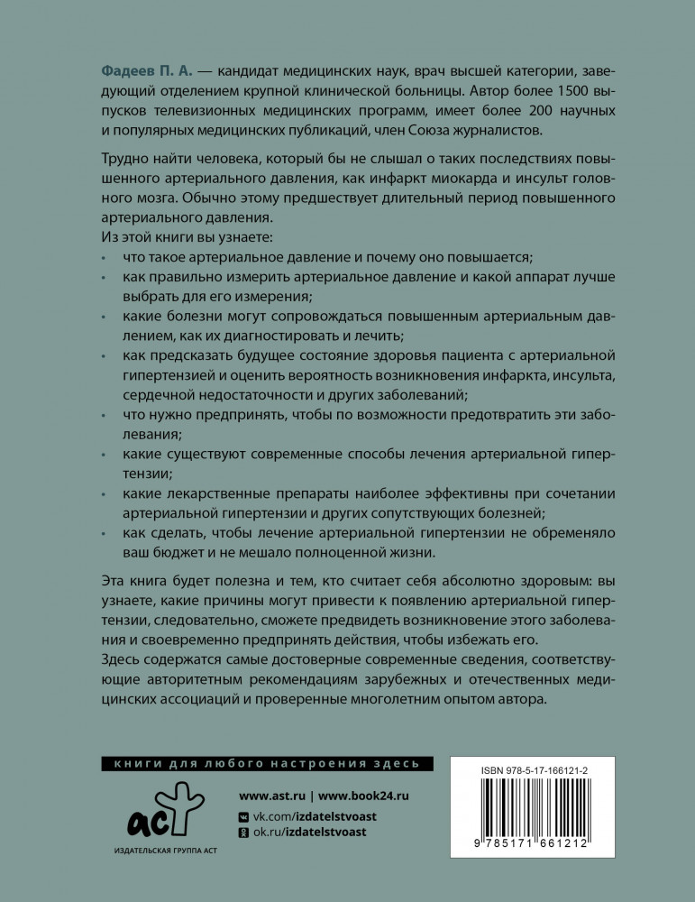 💳 Оплатить за товар можно при получении 🇰🇿 Есть бесплатная доставка по Казахстану от 1 дня 🎁 Копите бонусы с каждой покупки Серия: Азбука здоровья В книге в доступной форме изложены все основные вопросы, связанные с повышенным артериальным давлением. Читатель узнает, что такое артериальное давление и почему оно повышается; как правильно его измерить; какой аппарат для этого лучше выбрать; какие болезни сопровождаются повышенным артериальным давлением; какие существуют современные способы лечения артериальной гипертензии; какие лекарственные препараты наиболее эффективны. Здесь содержатся самые достоверные и современные сведения, соответствующие авторитетным рекомендациям зарубежных и отечественных медицинских ассоциаций и проверенные многолетним опытом автора. Для широкого круга читателей. |