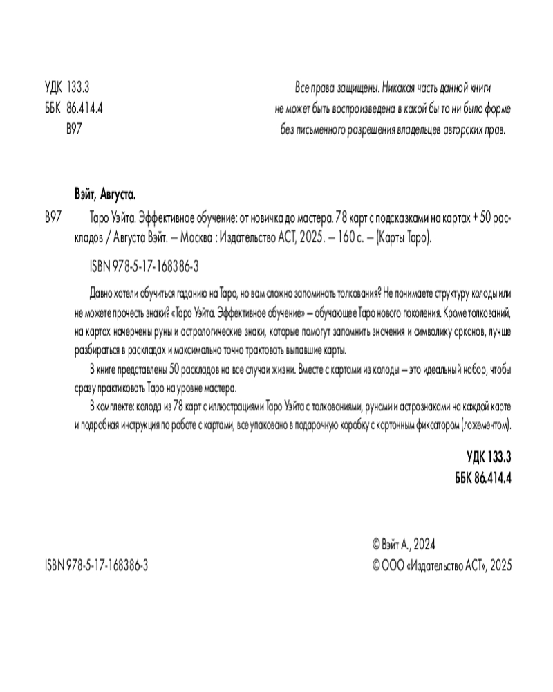 💳 Оплатить за товар можно при получении 🇰🇿 Есть бесплатная доставка по Казахстану от 1 дня 🎁 Копите бонусы с каждой покупки Серия: Карты Таро (Подарочная коробка с картами и книгой) Если вы хотели обучиться гаданию на Таро, но вам сложно запоминать толкования, если вы не понимаете структуру арканов или не можете прочесть знаки — эта обучающая колода для вас. «Таро Уэйта. Эффективное обучение» — обучающее Таро нового поколения. На картах начерчены толкования, руны и астрологические знаки, которые помогут запомнить значения карт, увидеть на них больше информации и трактовать выпавшие карты точнее. Чтобы начать практиковать Таро, вам нужен только этот комплект: в книге 50 раскладов, каждый из которых вы можете разложить и сразу же трактовать. Доверяйте своим толкованиям с первого предсказания! |