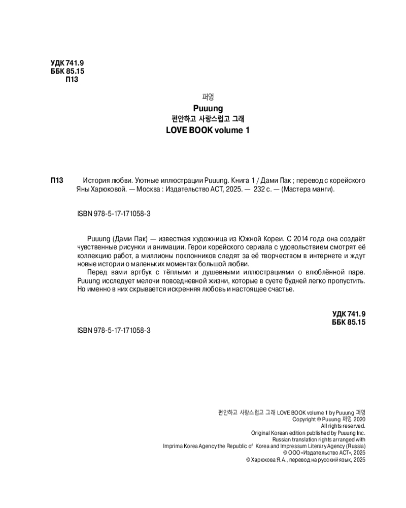 💳 Оплатить за товар можно при получении 🇰🇿 Есть бесплатная доставка по Казахстану от 1 дня 🎁 Копите бонусы с каждой покупки Серия: Мастера манги Puuung (Дами Пак) — известная художница из Южной Кореи. С 2014 года она создаёт чувственные рисунки и анимации. Герои корейского сериала с удовольствием смотрят её коллекцию работ, а миллионы поклонников следят за её творчеством в интернете и ждут новые истории о маленьких моментах большой любви. Перед вами артбук с тёплыми и душевными иллюстрациями о влюблённой паре. Puuung исследует мелочи повседневной жизни, которые в суете будней легко пропустить. Но именно в них скрывается искренняя любовь и настоящее счастье. |