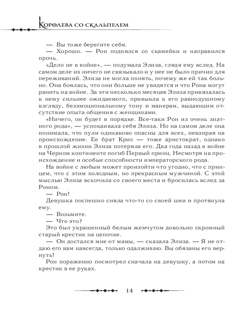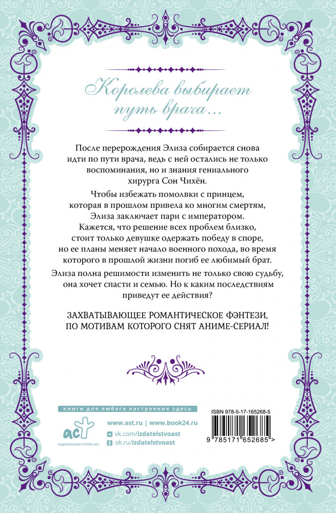 💳 Оплатить за товар можно при получении 🇰🇿 Есть бесплатная доставка по Казахстану от 1 дня 🎁 Копите бонусы с каждой покупки Серия: Новелла. Королева со скальпелем После перерождения Элиза собирается снова идти по пути врача, ведь с ней остались не только воспоминания, но и знания гениального хирурга Сон Чихён. Чтобы избежать помолвки с принцем, которая в прошлом привела ко многим смертям, Элиза заключает пари с императором. Кажется, что решение всех проблем близко, стоит только девушке одержать победу в споре, но ее планы меняет начало военного похода, во время которого в прошлой жизни погиб ее любимый брат. Элиза полна решимости изменить не только свою судьбу, она хочет спасти и семью. Но к каким последствиям приведут ее действия? |