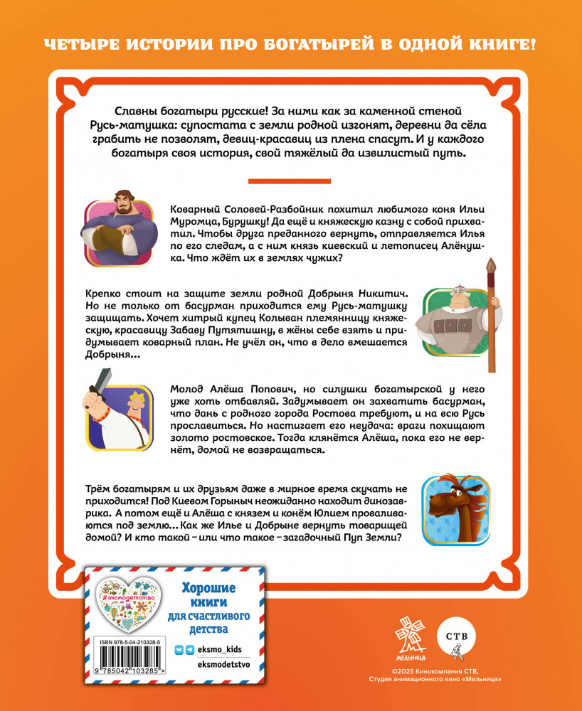 💳 Оплатить за товар можно при получении 🇰🇿 Есть бесплатная доставка по Казахстану от 1 дня 🎁 Копите бонусы с каждой покупки Серия: Три богатыря. Книги по фильмам По-настоящему богатырский сборник историй по мультфильмам из любимой франшизы! Сразу четыре истории в одной книге! Узнай, как Илья Муромец путешествовал в Византию, спас своего коня Бурушку и победил Соловья-разбойника, Добрыня Никитич невольно заполучил себе оруженосца, раскрыл коварные планы жадного купца и выручил княжескую племянницу, а Алёша Попович одолел басурман и вернул жителям Ростова захваченное золото. Ну а потом вместе с богатырями отправься в прошлое и раскрой тайну загадочного Пупа Земли! Красочное издание с цветными иллюстрациями на каждой странице станет отличным подарком любому фанату мультфильмов! |