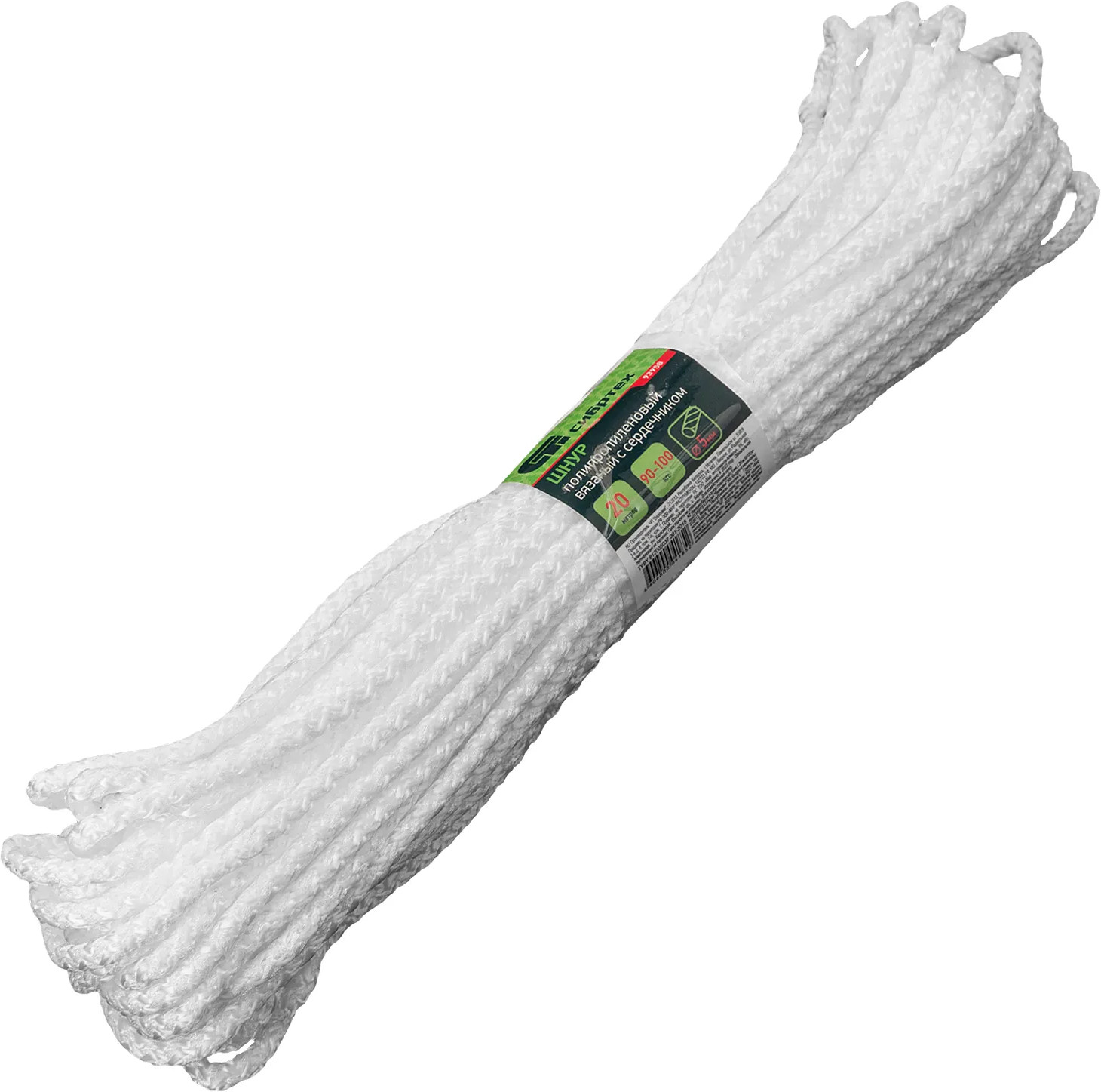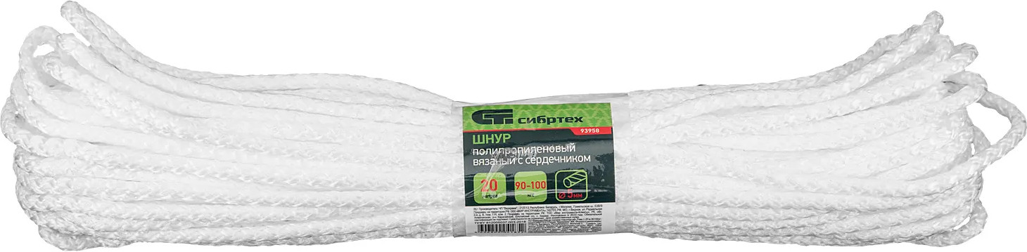 В данный момент этот товар отсутствует в продаже. Возможно, у нас найдется аналогичный или похожий товар здесь. Вязаный полипропиленовый шнур с сердечником Сибртех 93958 белого цвета, диаметром 5 мм, длиной 20 м, будет полезен для хозяйственных нужд: сушки белья, связывания предметов, подвязки растений. Пригодится также в походе, на охоте или рыбалке. Благодаря сердечнику и высокопрочной оплетке обладает повышенной устойчивостью к истиранию и разрыву — максимальная разрывная нагрузка составляет 90 кгс. Шнур выдерживает значительный вес, не растягивается и не провисает.
