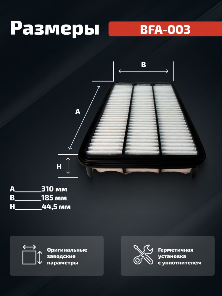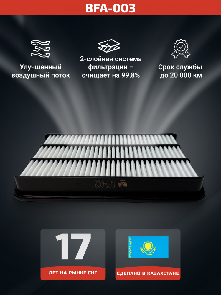 Рекомендации по замене: для поддержания максимальной эффективности работы двигателя рекомендуется менять фильтр через каждые 10 000–15 000 км пробега, либо чаще при эксплуатации в условиях повышенной запыленности. Совместимость с оригинальными номерами 17801-03010, 17801-74060 позволяет использовать BFA-003 в качестве надежного и доступного аналога заводских фильтров. |