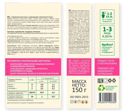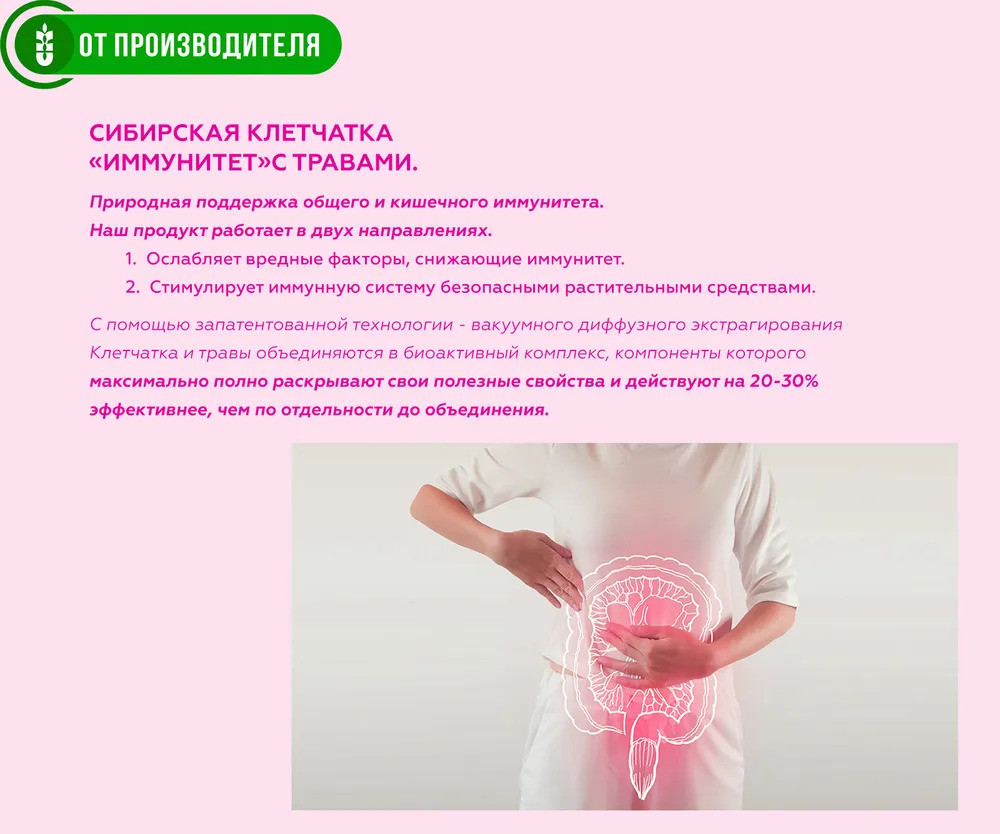 Сибирская клетчатка Клетчатка «Иммунитет плюс»В данный момент этот товар отсутствует в продаже. Возможно, у нас найдется аналогичный или похожий товар здесь. Сибирская клетчатка «Иммунитет плюс» полезна для микрофлоры кишечника, каждая частичка данной клетчатки пропитана специальным травяным чаем, повышающим иммунитет. Клетчатка играет неоценимую роль не только в нашем питании и пищеварении — грубые пищевые волокна необходимы для нормальной жизнедеятельности всего организма человека. Отсутствие в «современном» питании целлюлозы, лигнина, пектина и других видов пищевых волокон, не усваиваемых или трудно усвояемых нашим организмом является одной из главных причин столь стремительного роста числа таких тяжелых заболеваний связанных с нарушением обменных процессов и ослаблением иммунитета, как ожирение, сахарный диабет, рак, аллергия и др. |