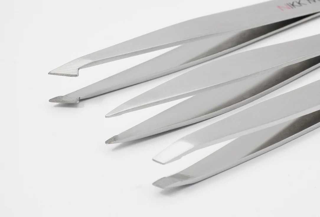 • острый пинцет со скошенным полотном захвата волосков. Скосый срез рабочей поверхности подразумевает особый угол ее расположения относительно стандартной формы. Такой уклон позволяет захватывать даже самые короткие толстенькие «пенечки». Нажим, как и у классического пинцета, мягкий и комфортный в работе. Материал изготовления — нержавеющая сталь, максимально долговечная и не создающая проблем в эксплуатации, дезинфекции и хранении. Скосый пинцет имеет розовое покрытие не скользит в руке, не боится стерилизации в автоклаве и сухожаре.Купить скосый пинцет этой конфигурации стоит тем мастерам, которые уже имеют в арсенале традиционный пинцет для удаления длинных тонких волосков. Эти две модели будут идеально дополнять друг друга. Если же нужны оба пинцета, то лучше их приобретать в наборе, так как его цена существенно ниже. В комплекте выпускается специальный наконечник из прозрачного пластика для предохранения заточки от повреждения и затупления;