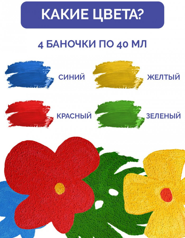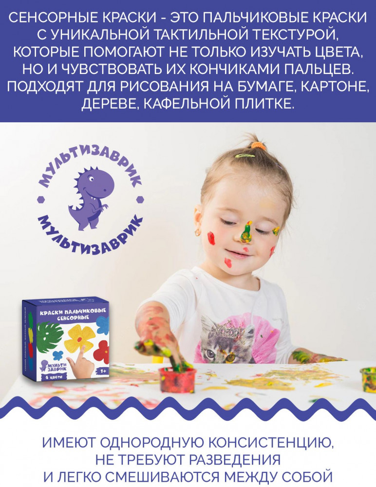 Сенсорные краски — это пальчиковые краски с уникальной тактильной текстурой, которые помогают не только изучать цвета, но и чувствовать их кончиками пальцев. Подходят для рисования на бумаге, картоне, дереве, кафельной плитке. Краски имеют однородную консистенцию, не требующую разведения, и легко смешиваются между собой. Безопасны для детей и нетоксичны при попадании в рот, не имеют резкого химического запаха. Легко смываются с рук и отстирываются с одежды. Краски сертифицированы и предназначены для детей от 1 года.