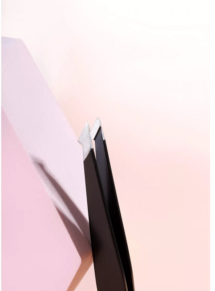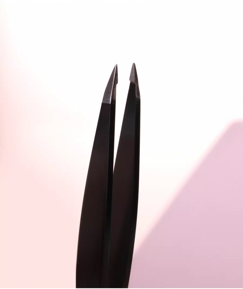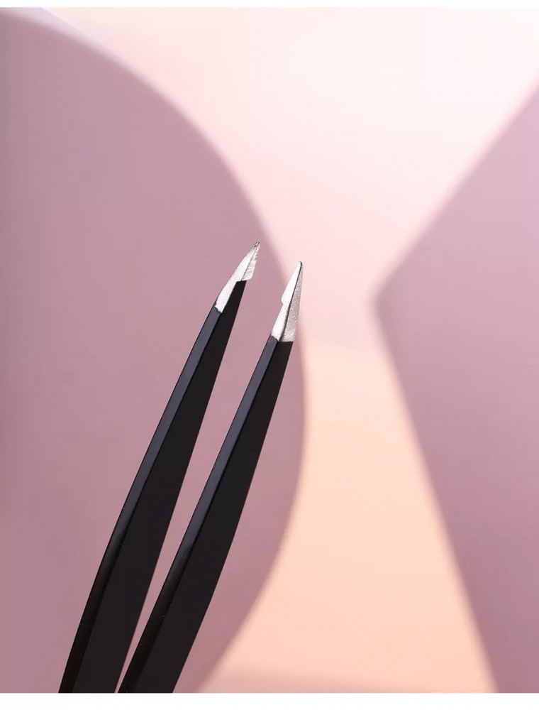 • острый пинцет со скошенным полотном захвата волосков. Скосый срез рабочей поверхности подразумевает особый угол ее расположения относительно стандартной формы. Такой уклон позволяет захватывать даже самые короткие толстенькие «пенечки». Нажим, как и у классического пинцета, мягкий и комфортный в работе. Материал изготовления — нержавеющая сталь, максимально долговечная и не создающая проблем в эксплуатации, дезинфекции и хранении. Скосый пинцет имеет розовое покрытие не скользит в руке, не боится стерилизации в автоклаве и сухожаре.Купить скосый пинцет этой конфигурации стоит тем мастерам, которые уже имеют в арсенале традиционный пинцет для удаления длинных тонких волосков. Эти две модели будут идеально дополнять друг друга. Если же нужны оба пинцета, то лучше их приобретать в наборе, так как его цена существенно ниже. В комплекте выпускается специальный наконечник из прозрачного пластика для предохранения заточки от повреждения и затупления;