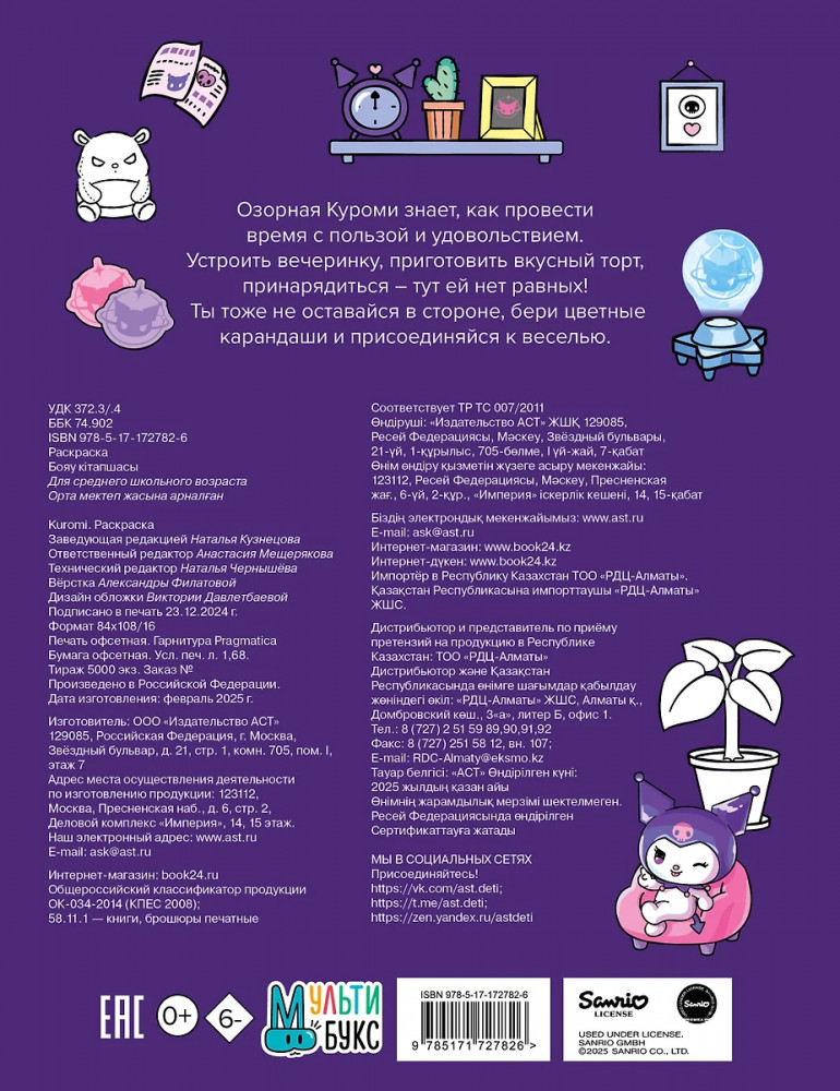 💳 Оплатить за товар можно при получении 🇰🇿 Есть бесплатная доставка по Казахстану от 1 дня 🎁 Копите бонусы с каждой покупки Серия: Куроми Озорная Куроми знает, как провести время с пользой и удовольствием. Устроить вечеринку, приготовить вкусный торт, принарядиться — тут ей нет равных! Ты тоже не оставайся в стороне, бери цветные карандаши и присоединяйся к веселью. |