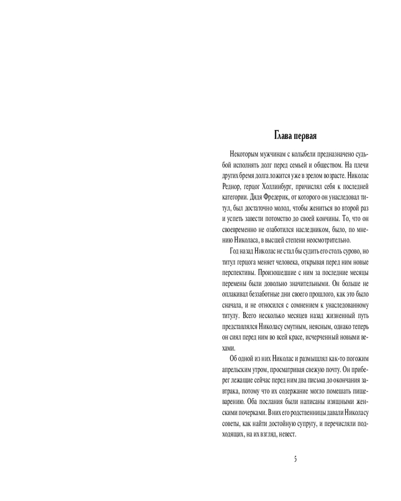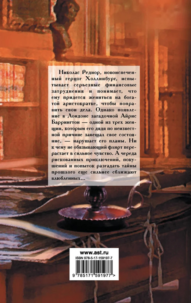 💳 Оплатить за товар можно при получении 🇰🇿 Есть бесплатная доставка по Казахстану от 1 дня 🎁 Копите бонусы с каждой покупки Серия: Шарм Николас Реднор, новоиспеченный герцог Холлинбург, испытывает серьезные финансовые затруднения и понимает, что ему придется жениться на богатой аристократке, чтобы поправить свои дела. Однако появление в Лондоне загадочной Айрис Баррингтон — одной из трех женщин, которым его дядя по неизвестной причине завещал свое состояние, — нарушает его планы. Ни к чему не обязывающий флирт перерастает в сильное чувство. А череда рискованных приключений, покушений и попыток разгадать тайны прошлого еще сильнее сближают влюбленных... |