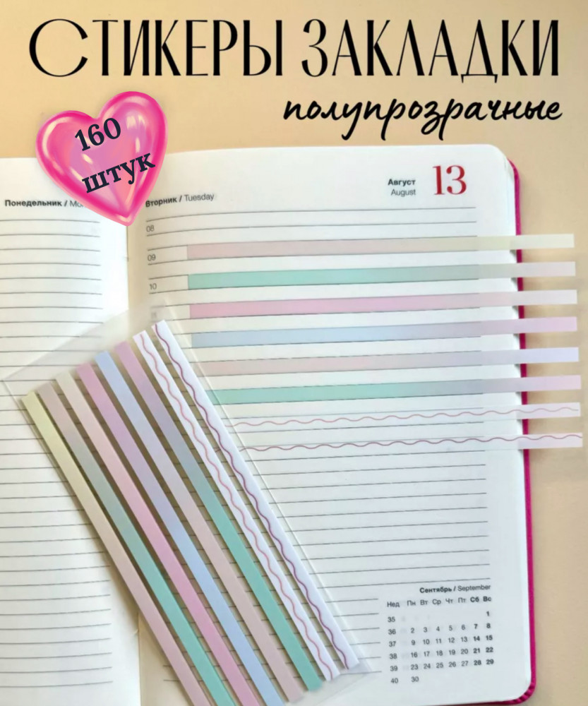 Чтение станет более продуктивным, так как вы сможете фиксировать понравившиеся цитаты из книг, запоминать или выписывать их. Самое главное, что вы можете снять стикер в любой момент. Параметры одной наклейки: длина 13.5 см и ширина 5 мм. Они изготовлены из высококачественного термопластика с клеевым краем с одной стороны. Стикерпак имеет матовое нежное покрытие, а стикеры полупрозрачные! Вы можете применять их для выделения текста в ежедневнике, планере и фотоальбоме, чтобы ни одна важная запись не осталась без внимания. Кроме того, вы можете использовать их в миксе с другими наклейками в своих творческих проектах.
