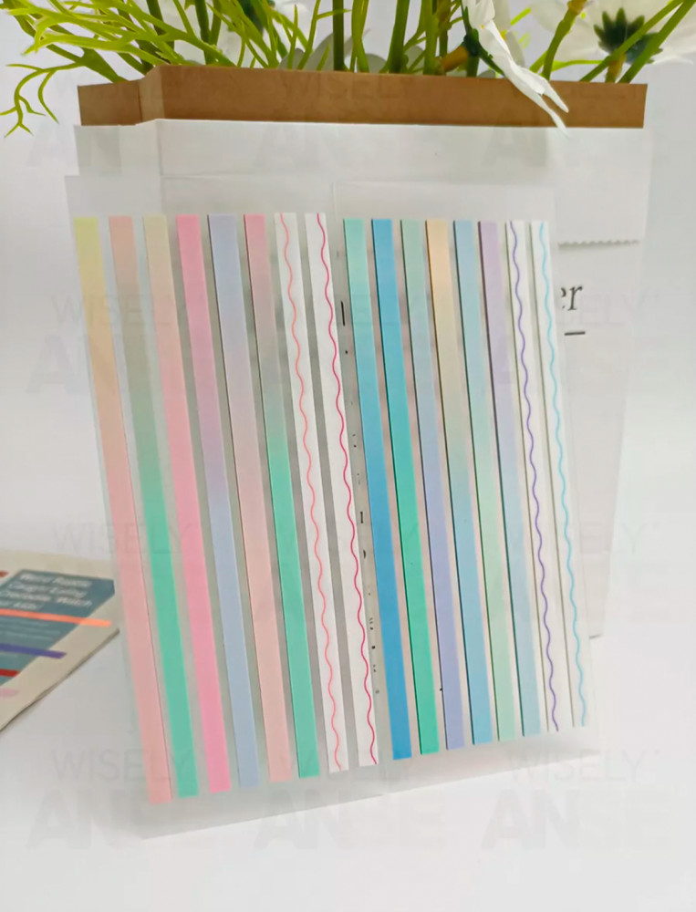 Стикеры из 8 полосок по 20 штук каждого цвета. Наклейки выполнены в нежных пастельных оттенках, в стиле юникорн, что делает их еще более привлекательными. Поскольку цвет имеет градиентную технику, переходы могут немного отличаться! Если стикерпак созвучен с вашей индивидуальностью, то он идеально подойдет для вас! Мы надеемся, что эти наклейки подарят вам позитивные эмоции и помогут выразить ваше творческое «я».