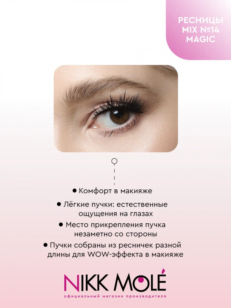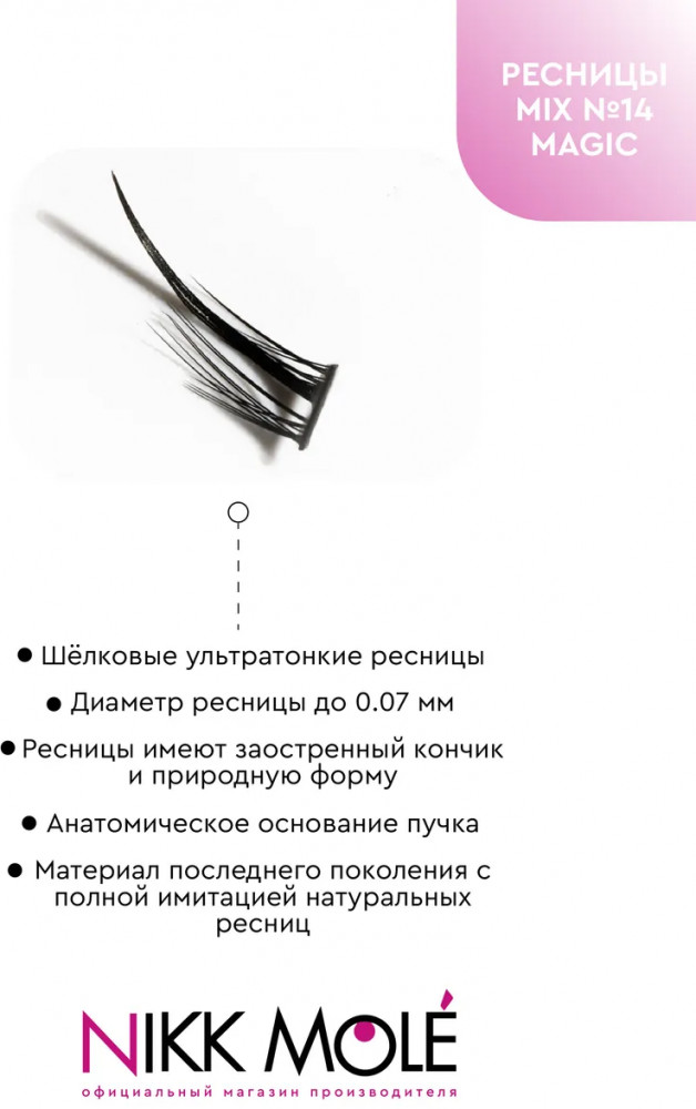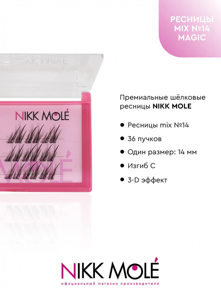 Набор накладных ресниц Nikk Mole в пучках для создания эффекта объемных, густых, длинных ресниц от природы. Благодаря минимальному диаметру реснички (всего 0.07 мм), пучки естественным образом дополняют природную ресничную линию. Распахнутый взгляд и пушистые ресницы, украшающие любой макияж. Премиальное качество с использованием новейшего ультратонкого материала. Форма каждой реснички имеет органичное заострение к кончику, искусственные ресницы фактически не отличить от настоящих.
